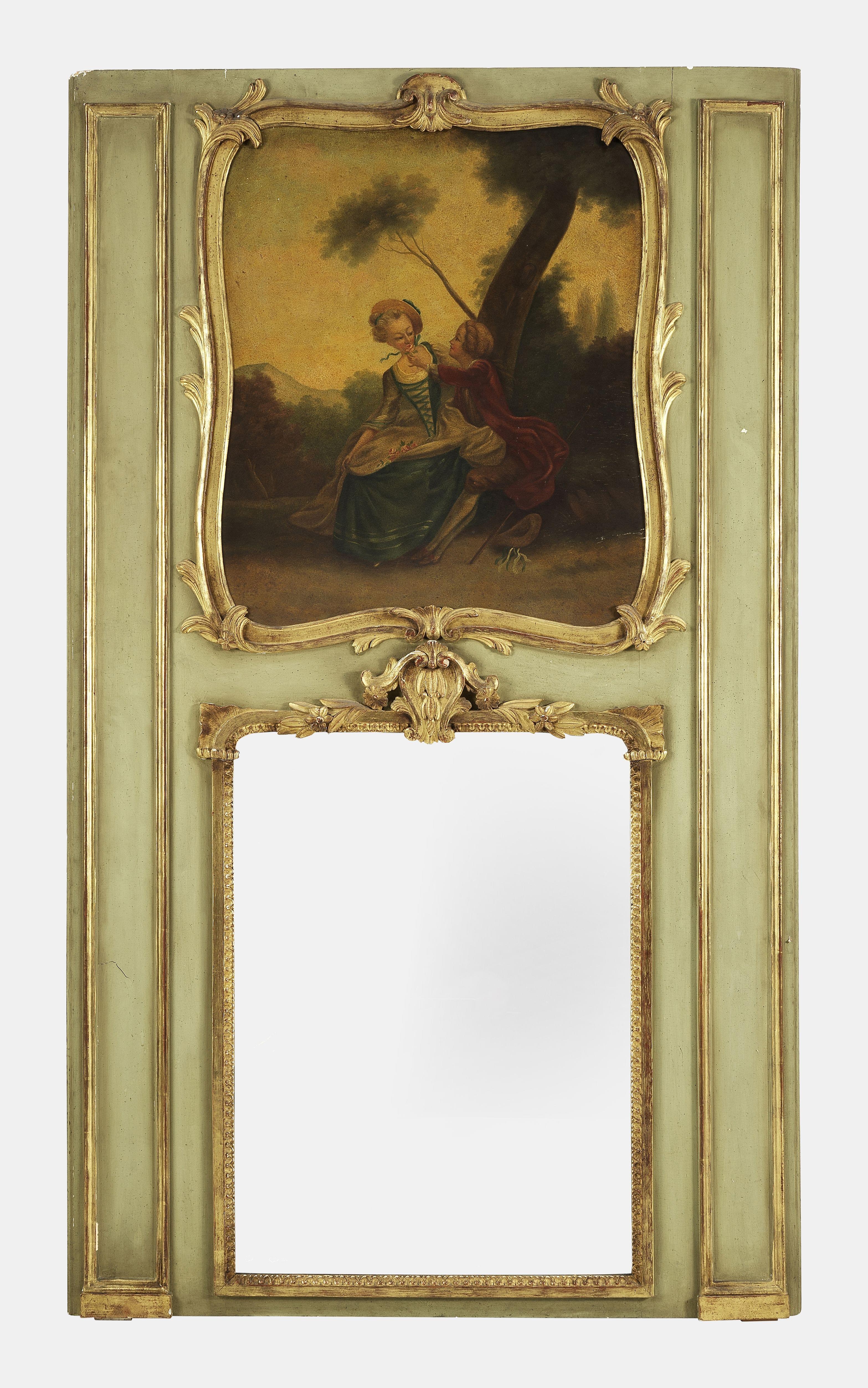 Bois stuqué et doré orné d'une reproduction dans le goût des scènes galantes du XVIIIe s, 183x107 cm