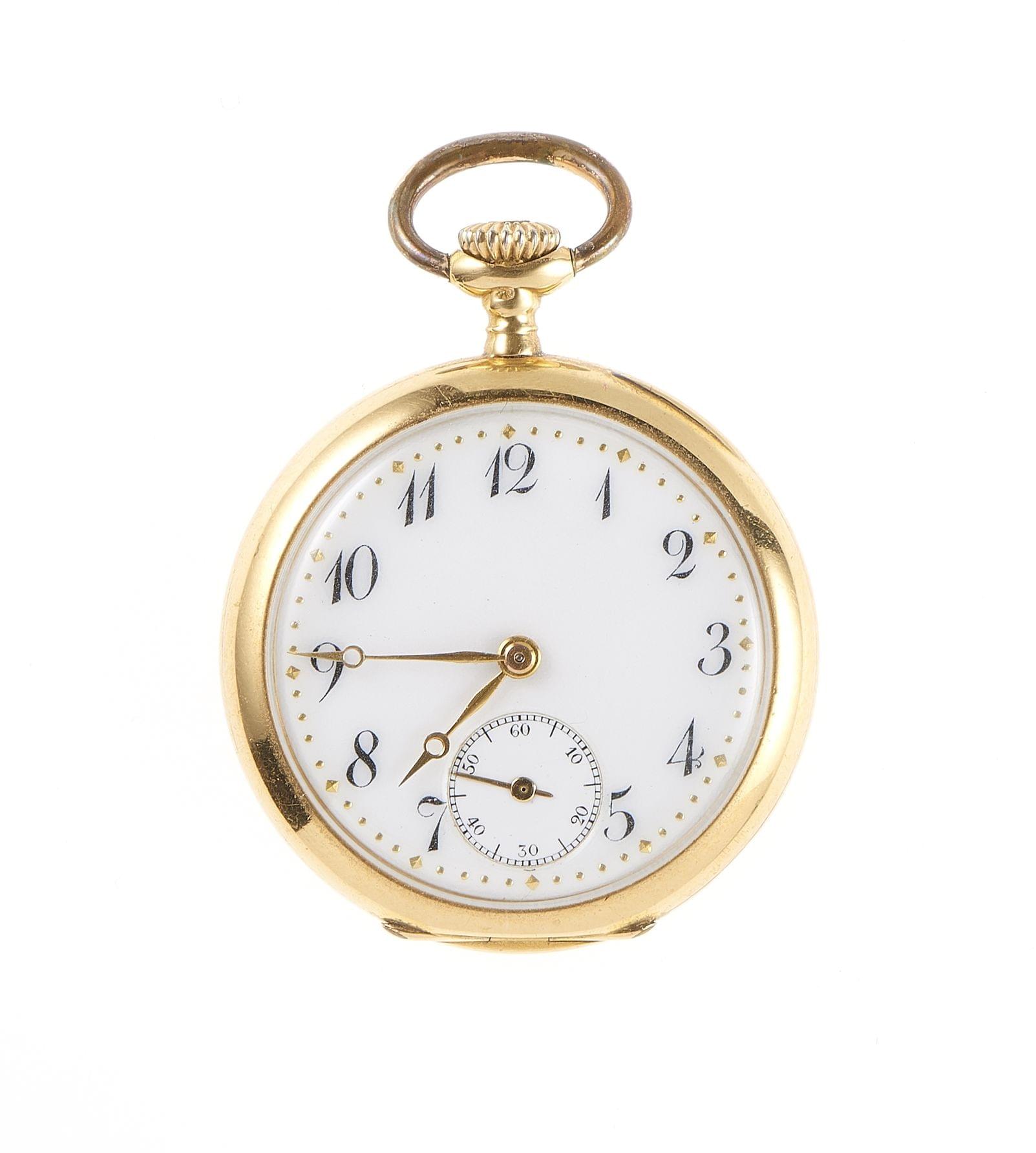 Cadran émaillé blanc, aiguilles dorées, chiffres arabes bleus, secondes à 6h, circa 1916, or 750, D 28 mm, poids brut 22 g