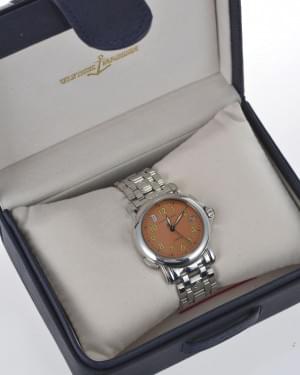 Cadran saumon, chiffres arabes et aiguilles luminescents, second fuseau horaire à 11h, date à guichet à 3h, réf 203-22-7, acier, D 36 mm, dans son écrin, avec certificat, deux maillons supplémentaires