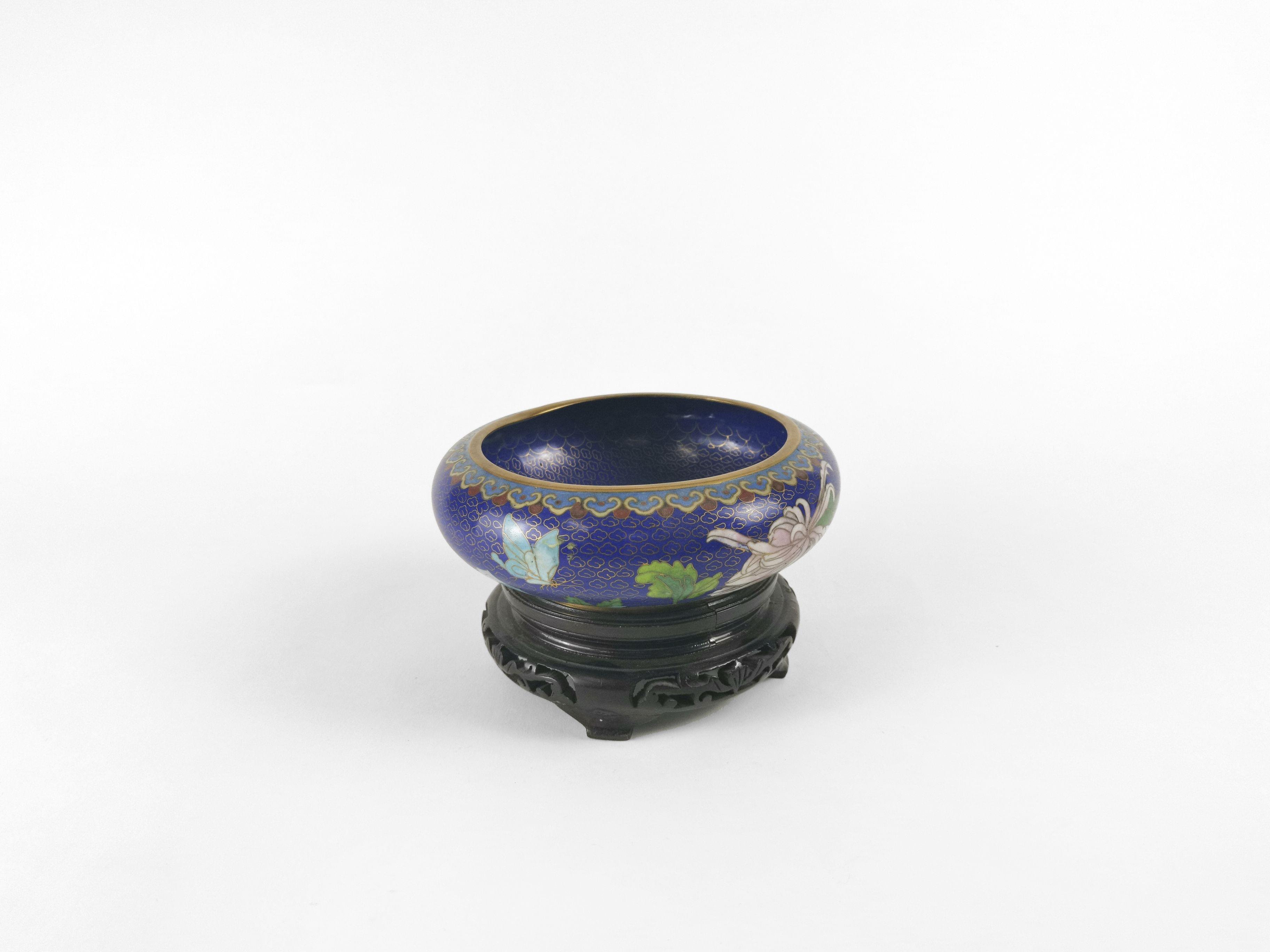 Cuivre et émaux polychromes à décor de fleurs sur fond bleu et jaune, H 14 et D 17 cm
