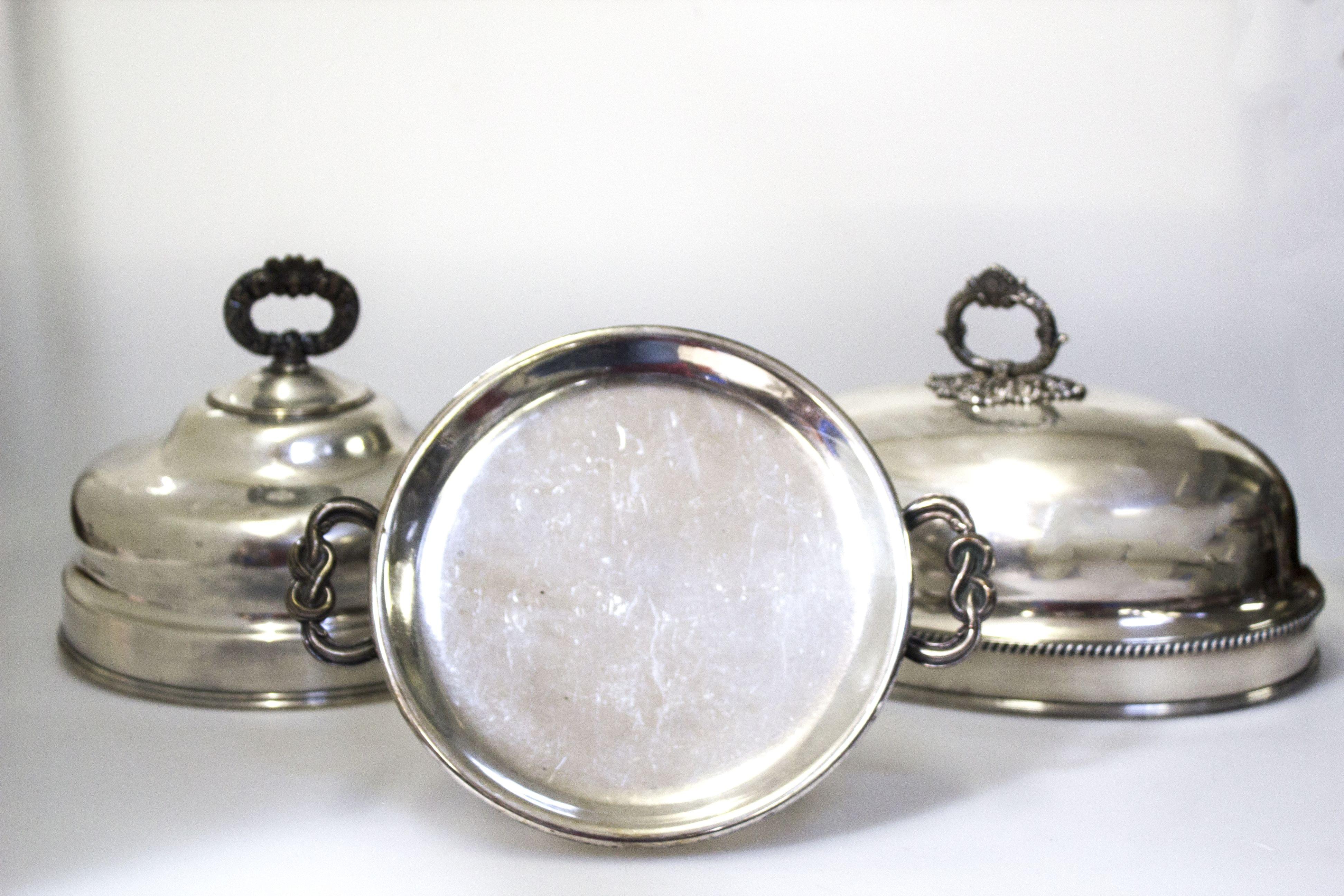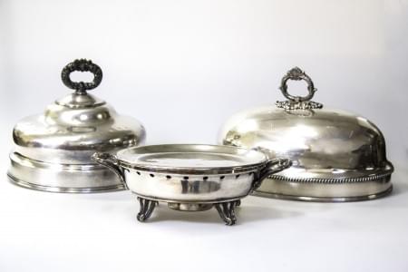 3320. Un réchaud rond et deux cloches de service, l'une ronde, l'autre ovale