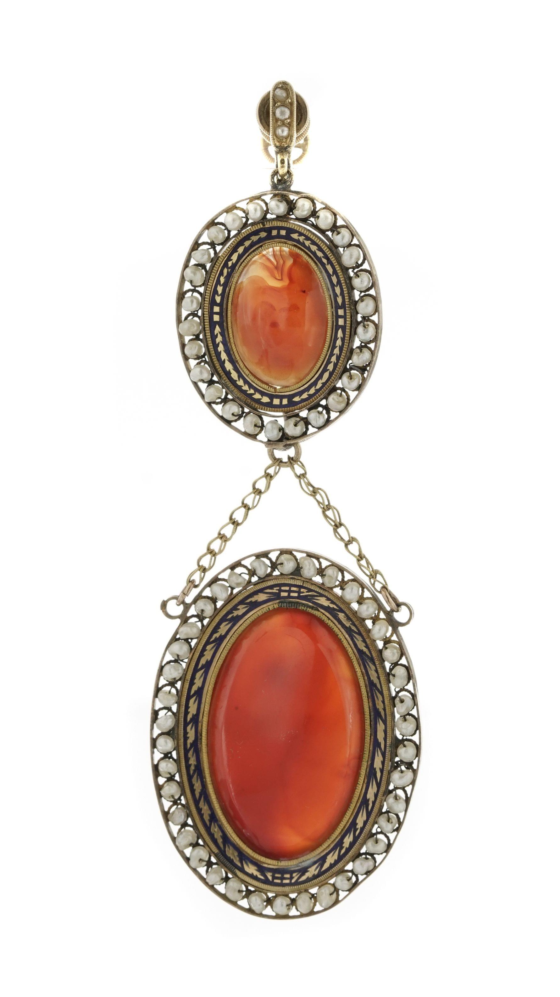 3101. Une boucle d'oreilles pouvant former un médaillon serti de deux cabochons de cornaline entourés de perles