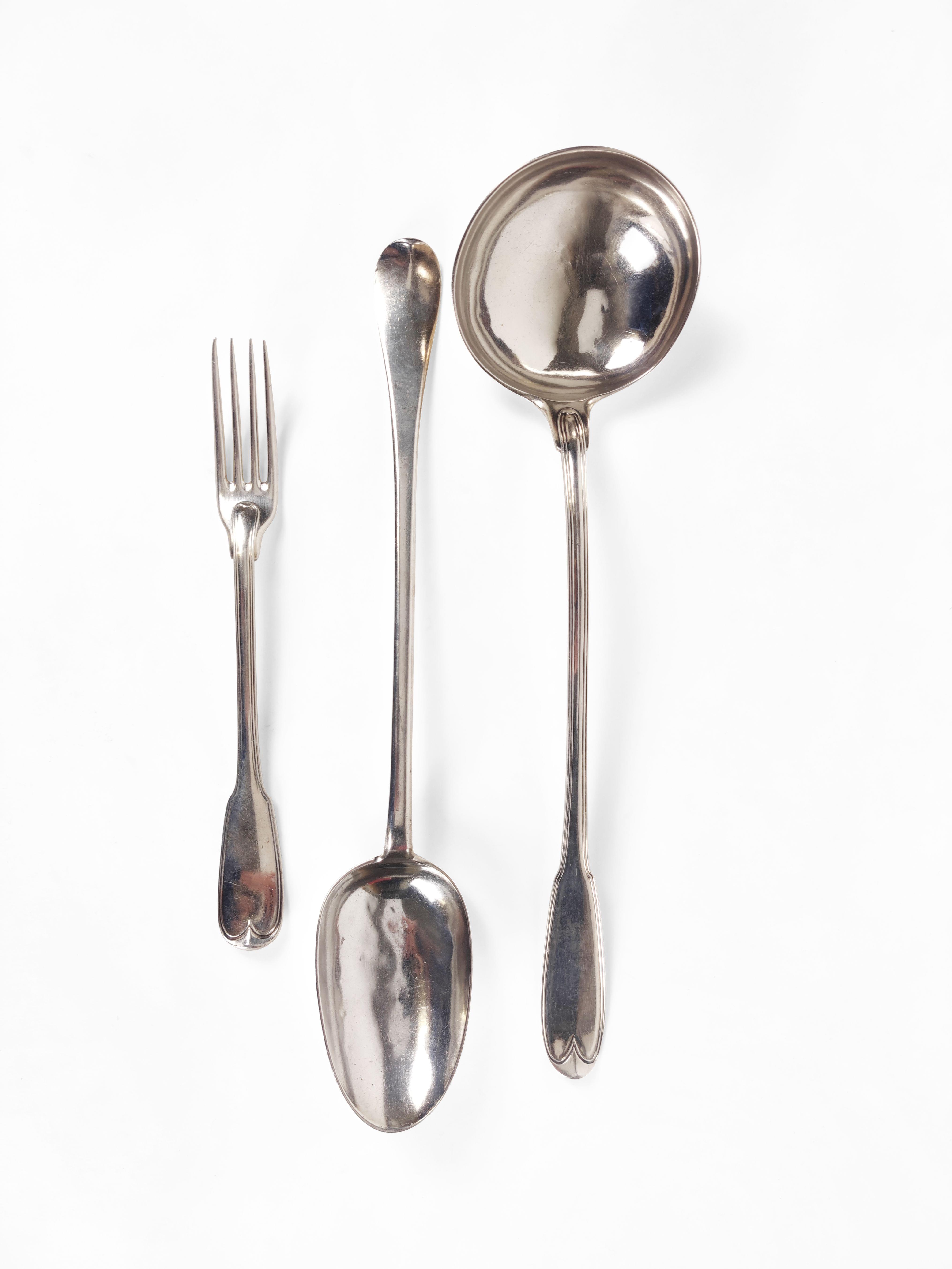 3752. Une cuillère à ragoût armoriée, une fourchette de service et une louche