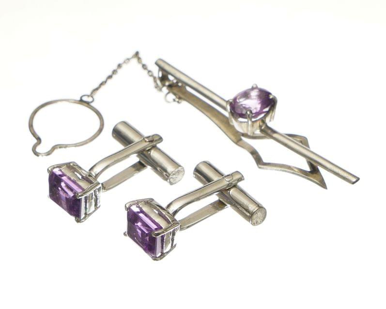 3047. Une épingle à cravate et une paire de boutons de manchette sertis d'améthystes