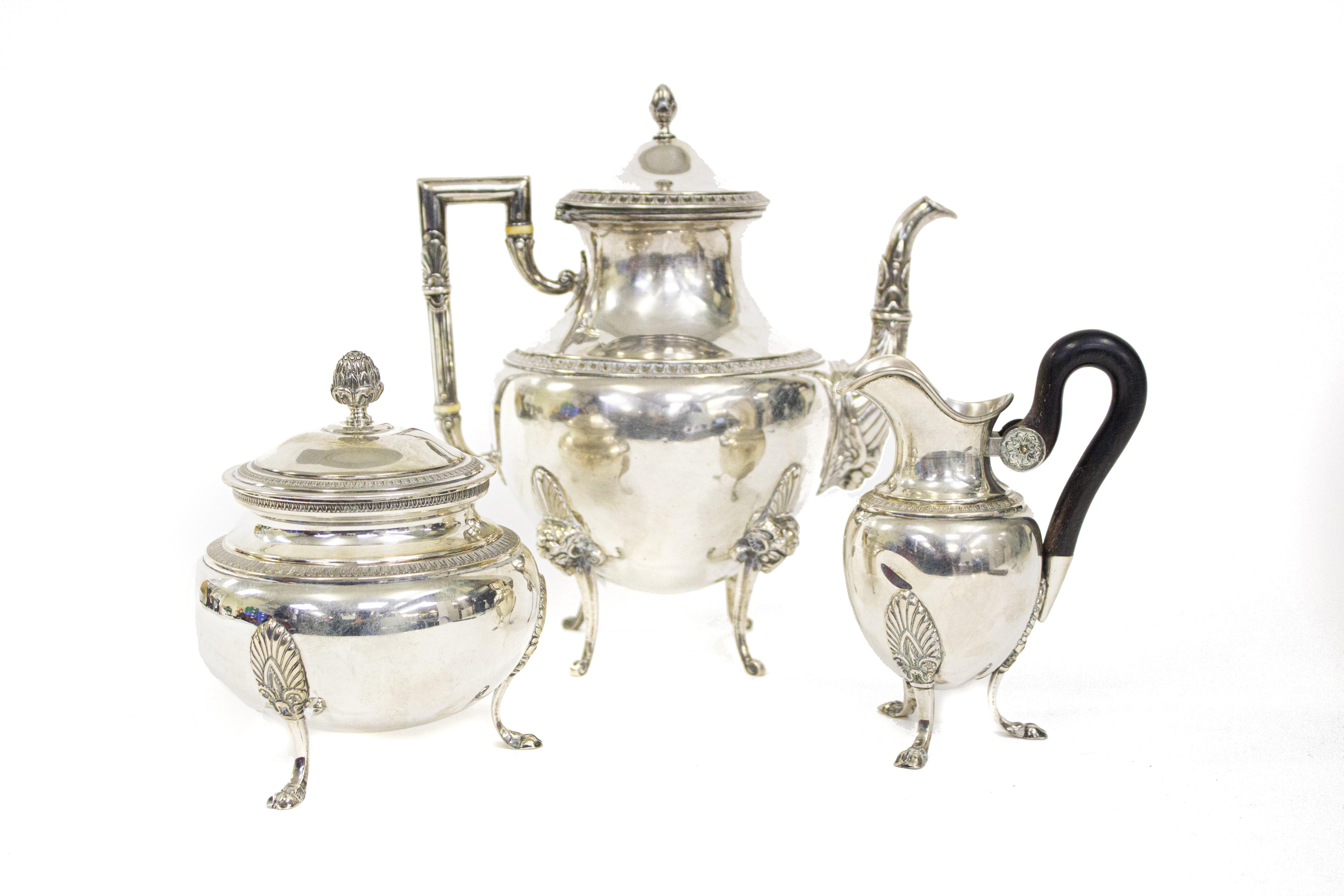 3488. Une théière,un sucrier et un crémier de style Empire à décor de feuilles d'eau