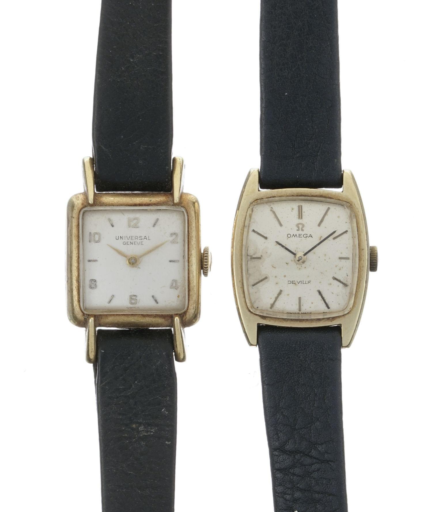 L'une à cadran crème, aiguilles et index bâton noirs, boîtier en or 750, 20x20 mm, l'autre à cadran crème, aiguilles et chiffres arabes dorés, boîtier en or 750, 20x20 mm, poids brut 34 g
