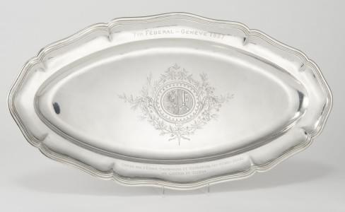 843. Plat ovale festonné gravé aux armes de Genève et dédicacé pour l...