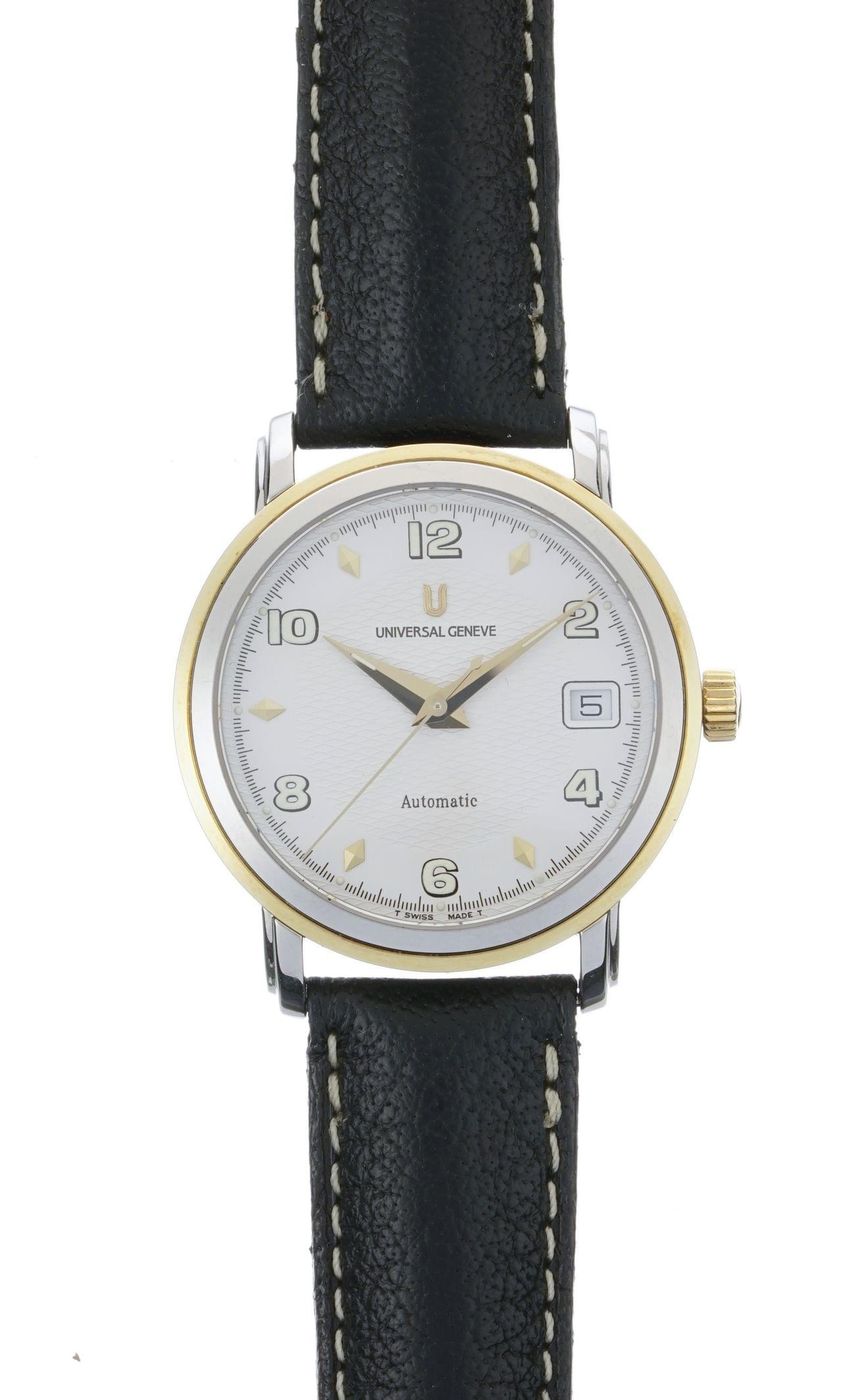 Cadran crème guilloché, aiguilles dorées, chiffres arabes luminescents, date à guichet à 3h, acier et métal doré, D 35 mm, dans sa double boîte