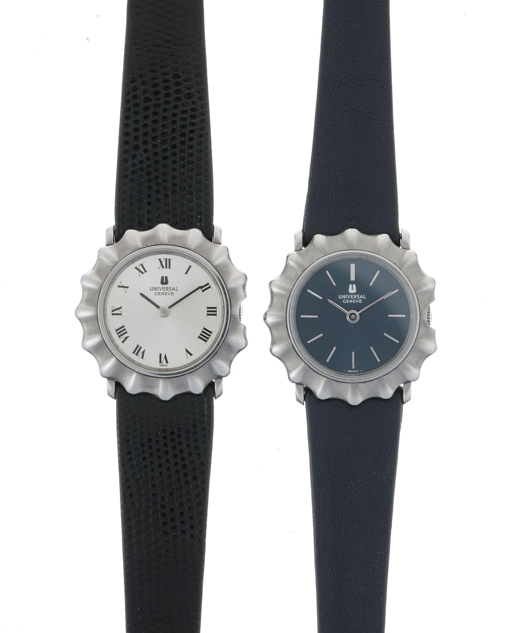L'une à cadran sombre, aiguilles et index bâton argentés, acier, D 20 mm, l'autre à cadran gris, aiguilles et chiffres romains noirs, acier, D 20 mm