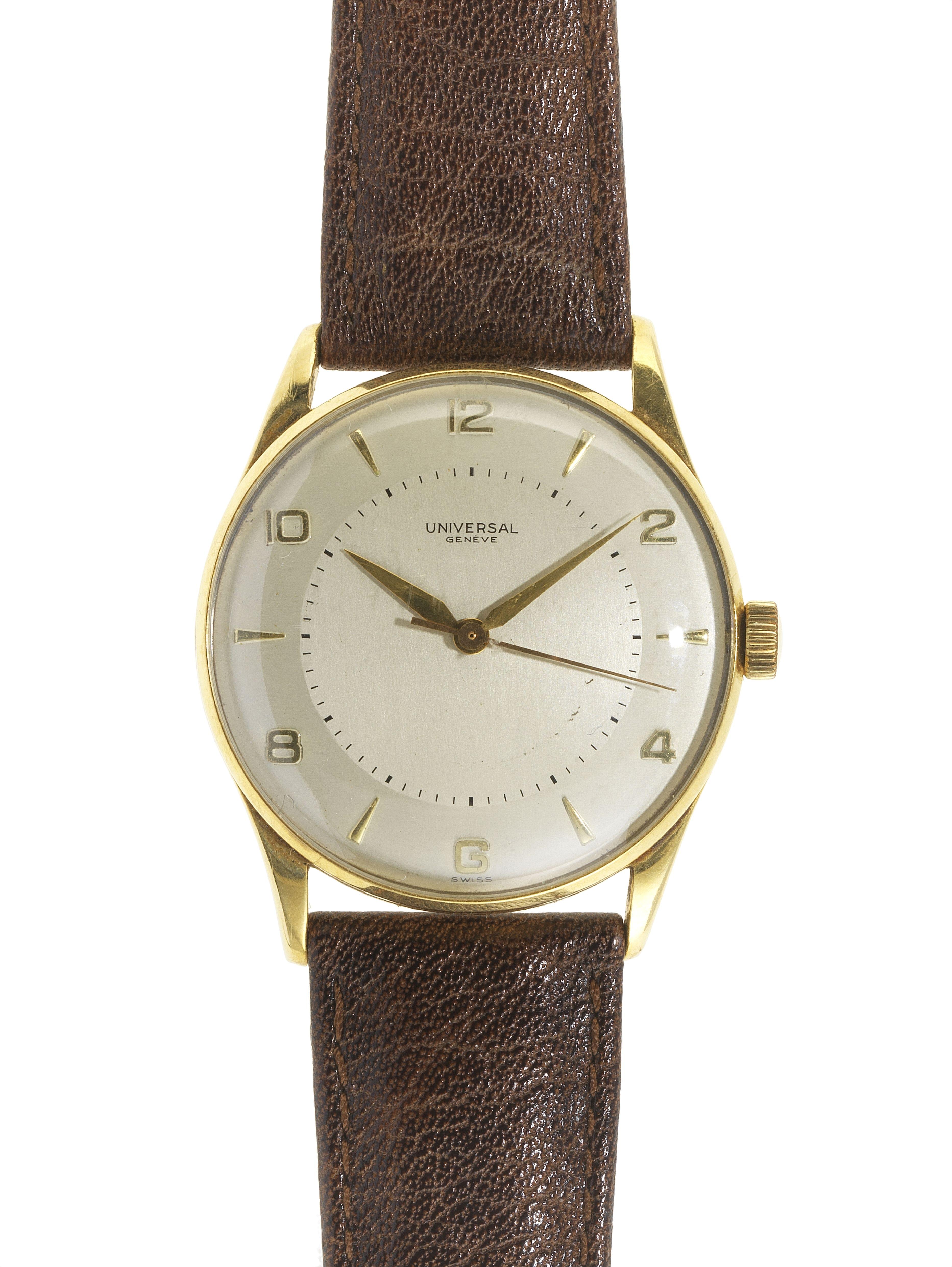 Cadran argenté, aiguilles et chiffres arabes dorés, boîtier en or 750, D 34 mm, poids brut 32 g