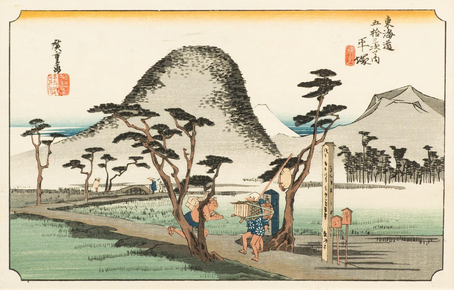 Station du Tokaïdo, estampe en couleurs, 23x37 cm