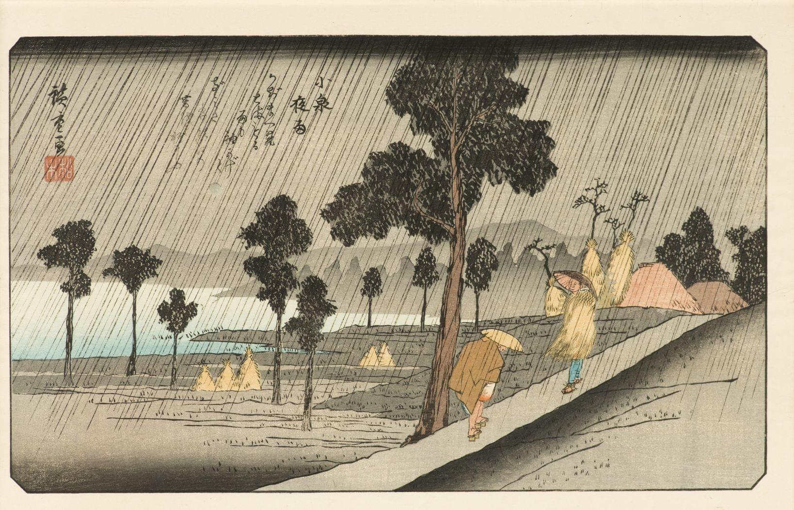 Station du Tokaïdo, estampe en couleurs, 23x37 cm