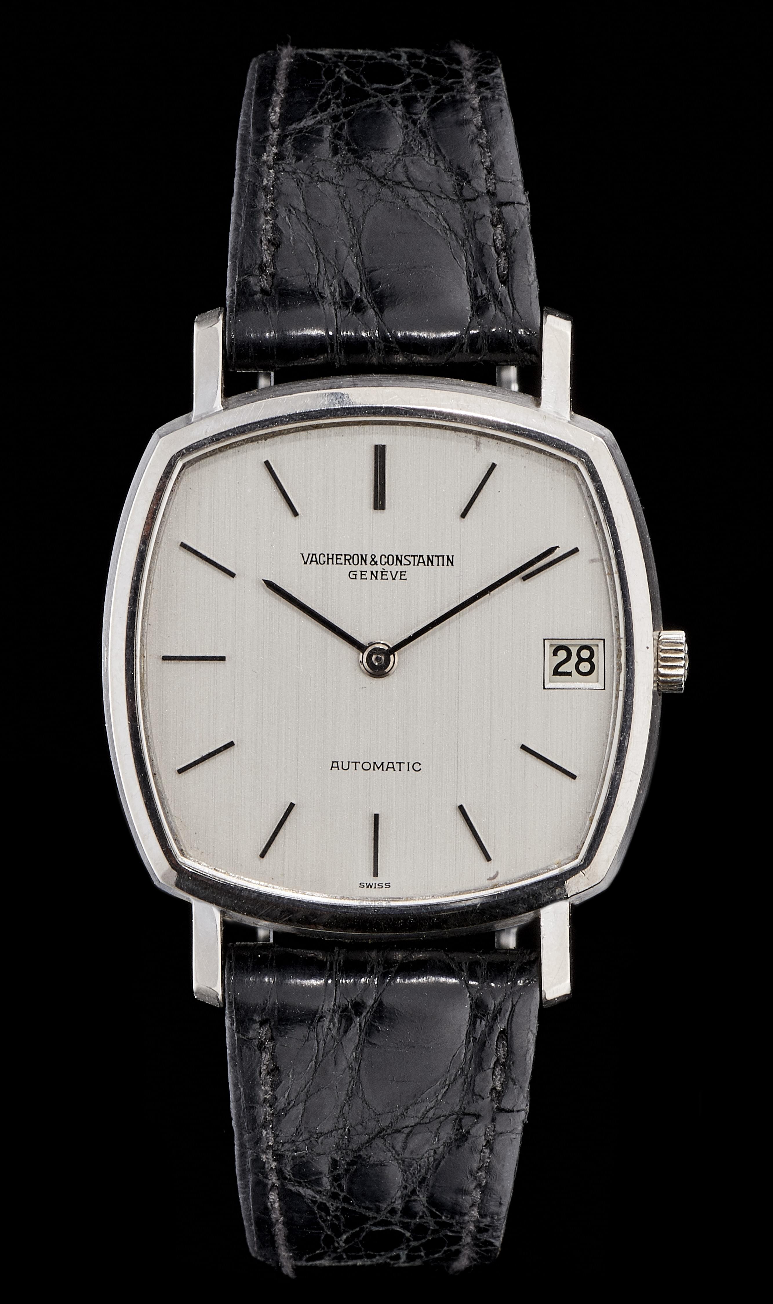 Cadran argenté, index bâtons et aiguilles noirs, date à guichet à 3h, or gris 750, 31x31 mm, poids brut 39 g