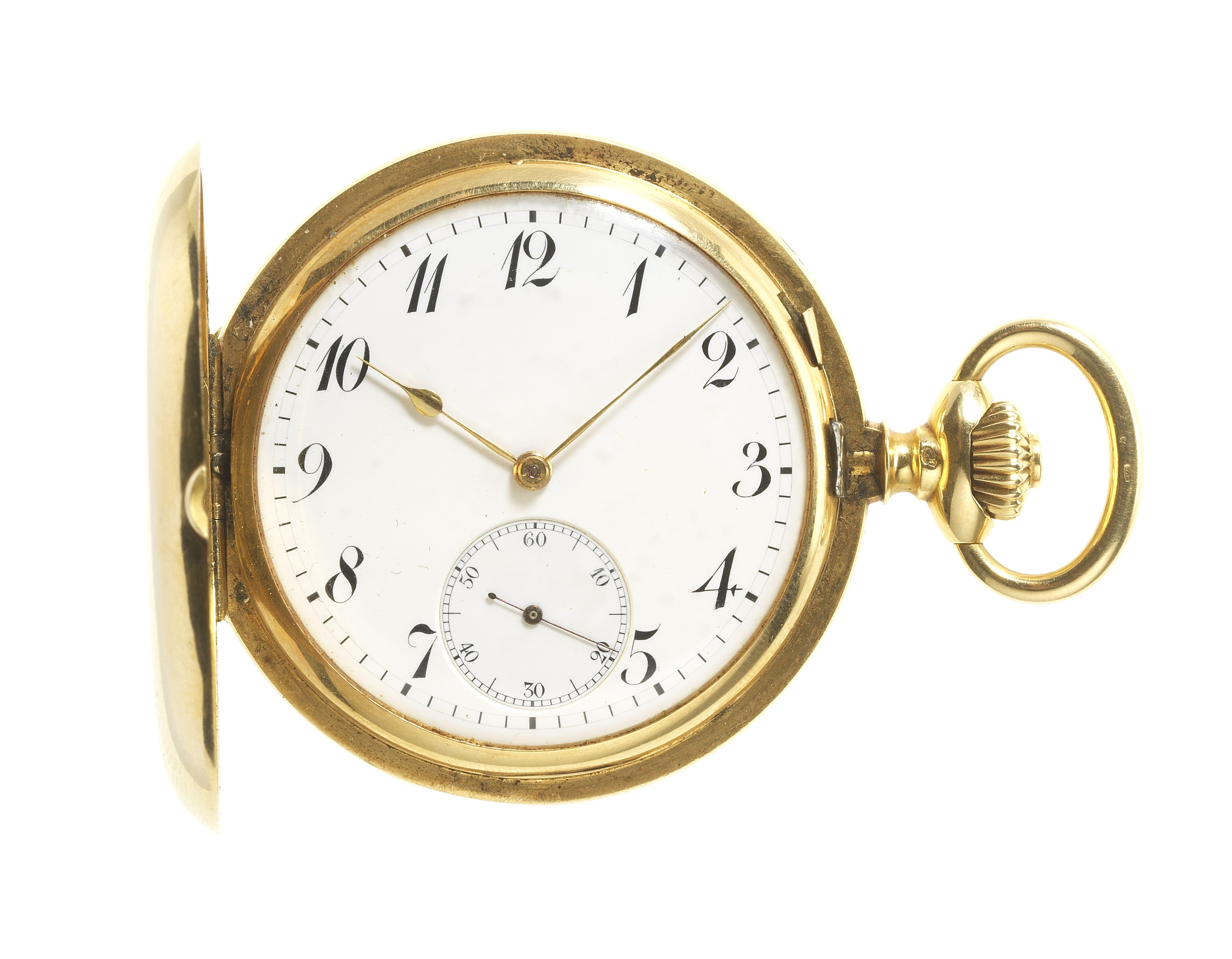 Cadran émaillé blanc, aiguilles dorées, chiffres arabes noirs, secondes à 6h, or 750, D 50 mm, poids brut 111 g