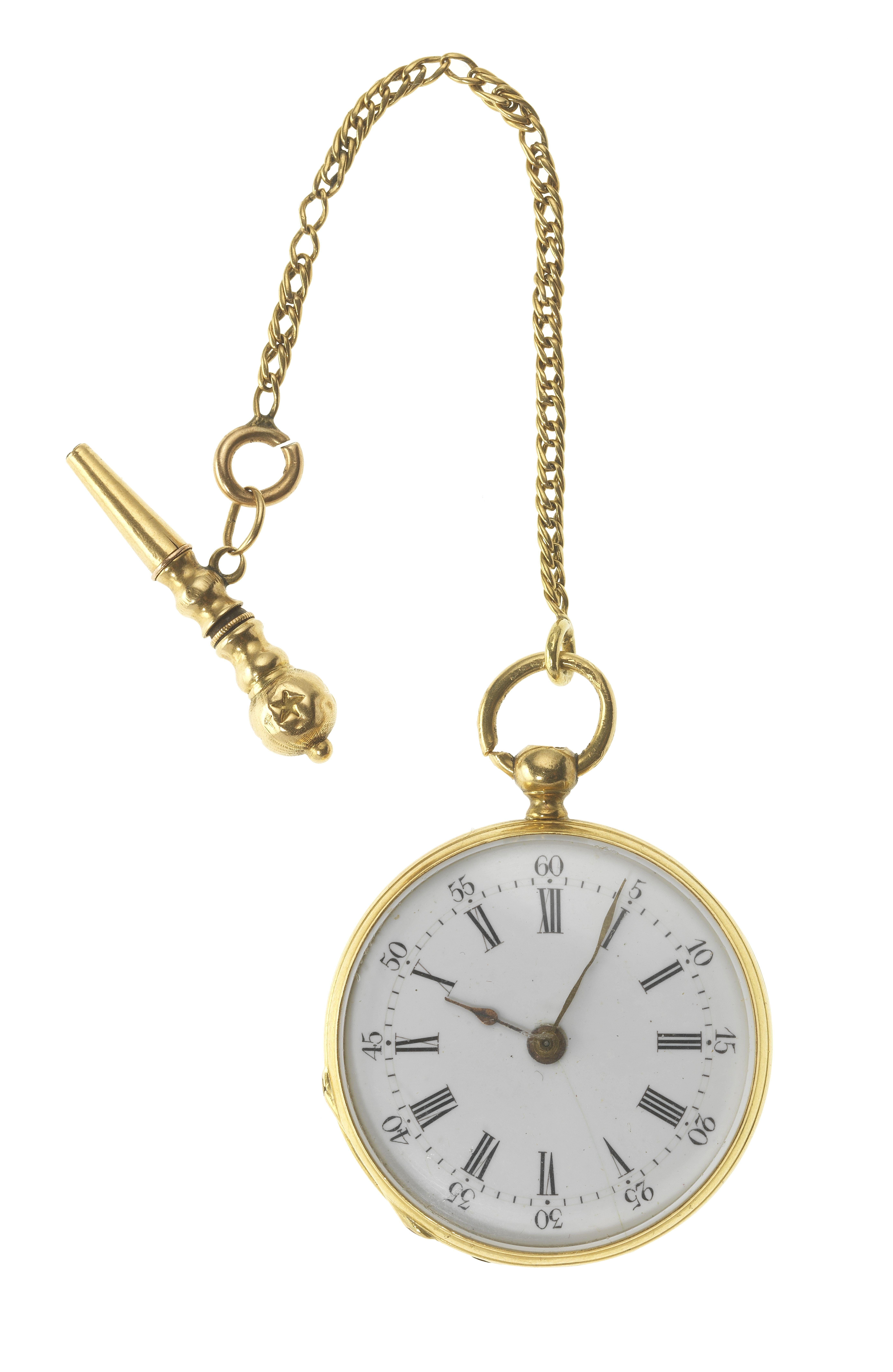 Cadran émaillé blanc, aiguilles dorées, chiffres romains noirs, or 750, D 30 mm, avec son remontoir, couronne manquante