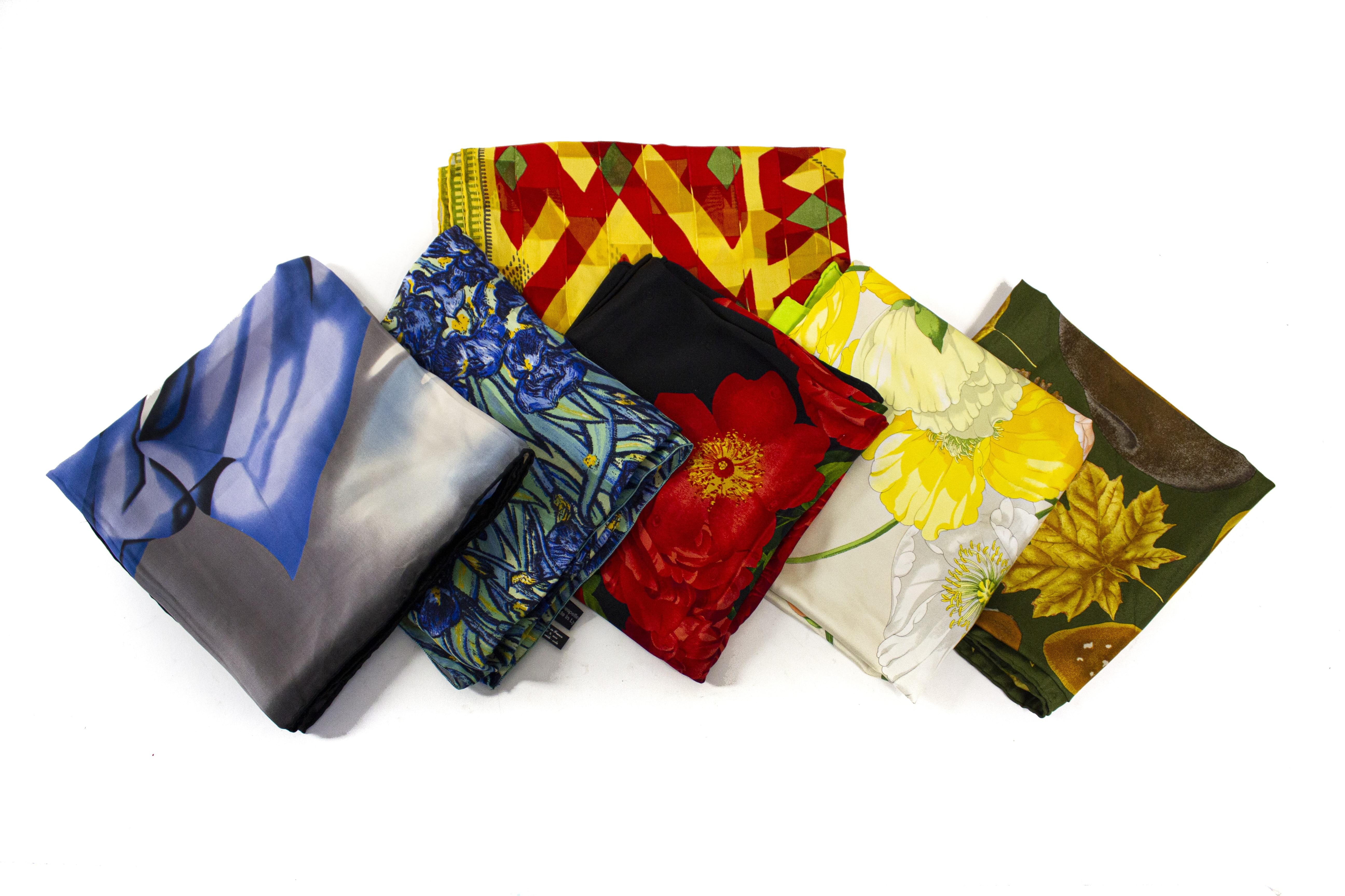 Soie, 86x86 cm et 115x150 cm. On joint trois foulards en soie.
