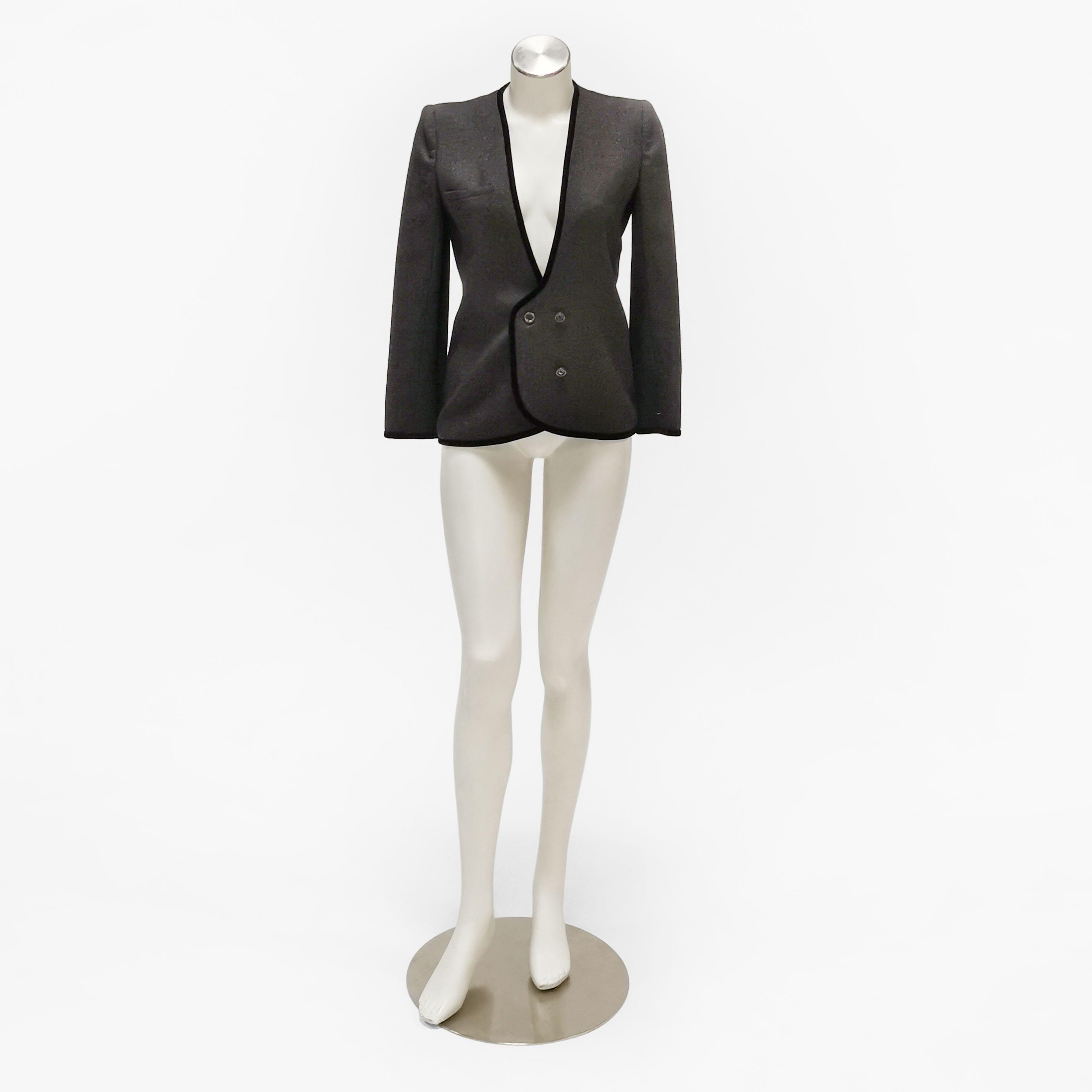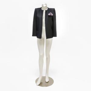 L'une en flanelle et surpiqûre en satin noir, intérieur en soie noire, fermeture croisée à quatre boutons; la deuxième en coton et lin bleu marine ; la troisième en laine et cachemire chocolat avec un col plissé en satin, fermeture un bouton. taille 6. Chemisier en soie et mousseline de soie beige à surpiqûre camel, taille 6