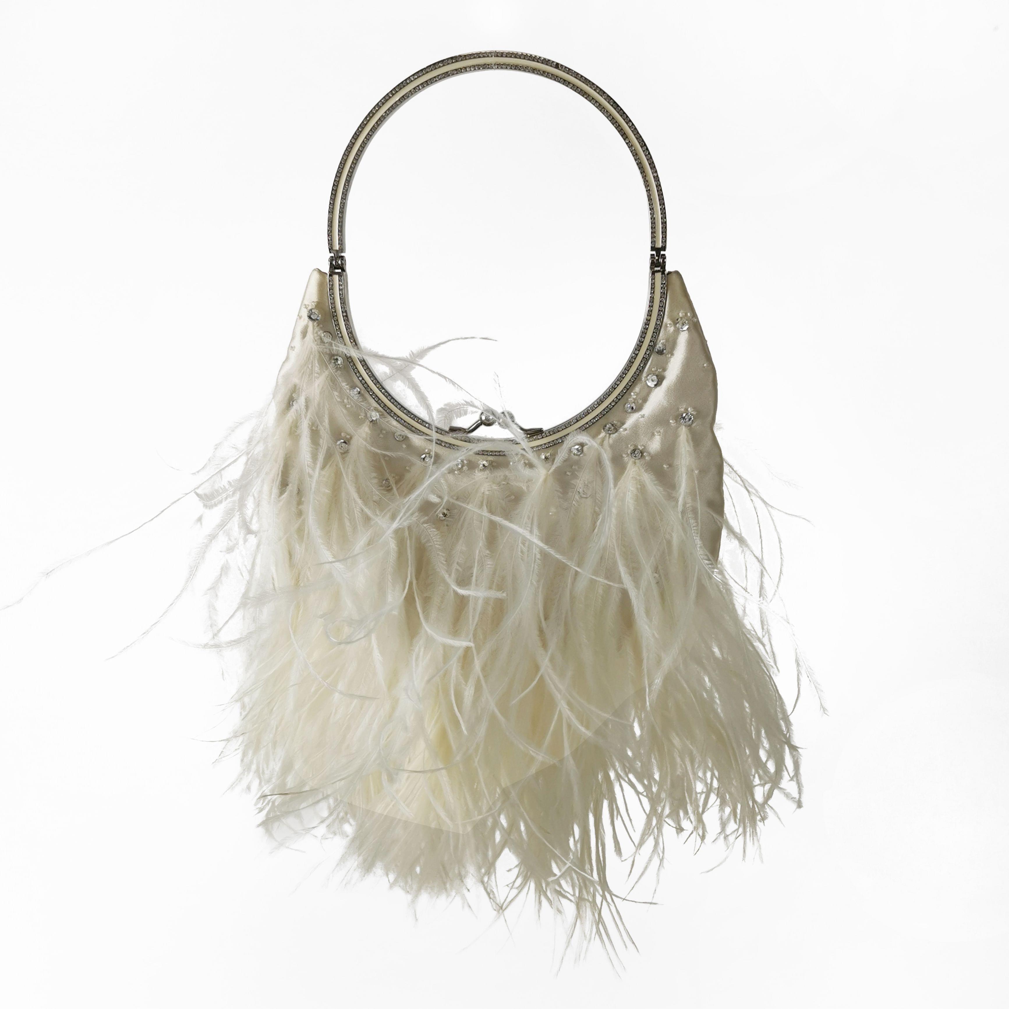 Satin orné de plumes d'autruche blanches, perles et strass, poignée en forme d'anneau, 20x15 cm