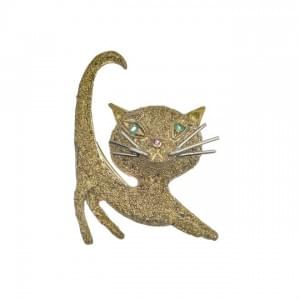 219. Broche à motif de chat s'étirant, aux yeux sertis d'émeraudes et...