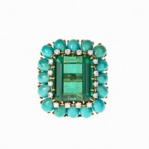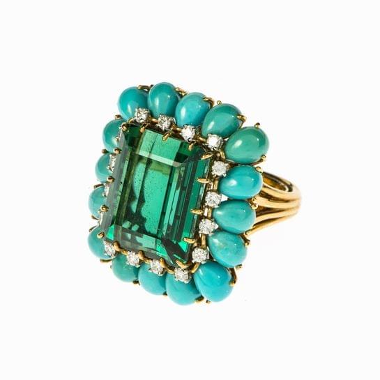520. Van Cleef & Arpels, bague sertie d'une tourmaline verte (env 16 ct) taille émeraude entourée de turquoises et diamants