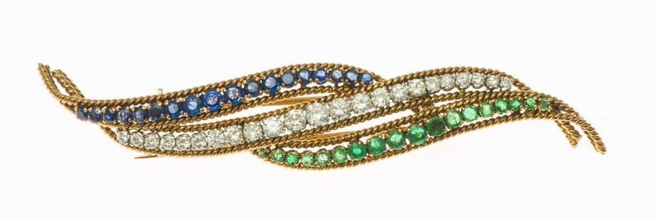 518. Van Cleef & Arpels, broche sertie de trois lignes de diamants, de saphirs et d'émeraudes
