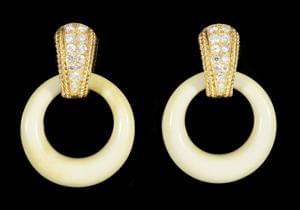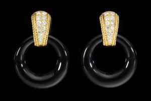 91. Van Cleef & Arpels, clips d'oreilles sertis de diamants et retenant trois paires d'anneaux interchangeables en or, onyx et ivoire