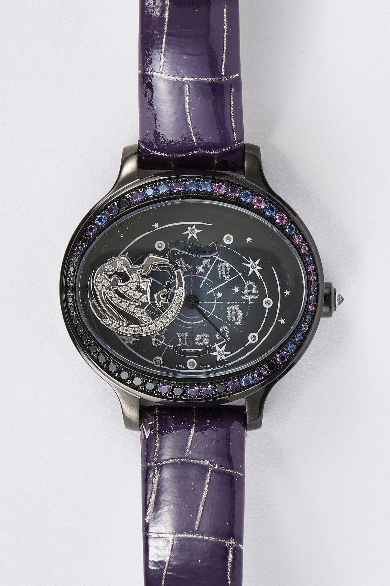 Cadran noir décoré des symboles astrologiques et orné d'un symbole mobile serti de diamants, aiguilles argentées, index à points sertis de diamants, acier noirci, 36x40 mm