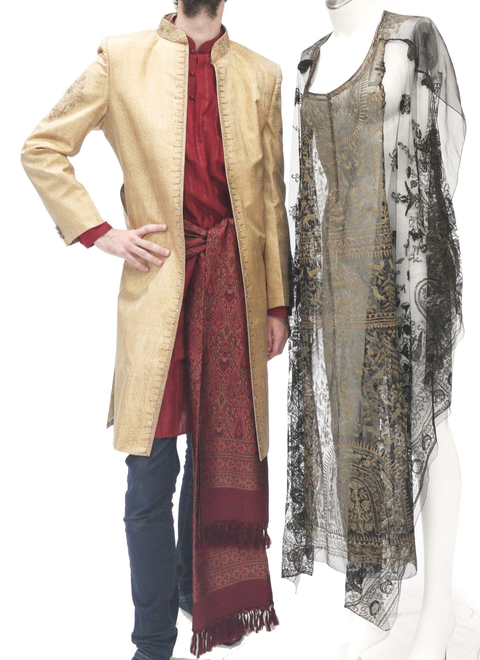 Une veste longue dorée ornée de broderies et une tunique brodée couleur brique, avec un châle assorti, coton et soie. On joint une tunique en voilage brodée de fils dorés à motifs d'animaux. Provenance: collection Pernet-Villaverde