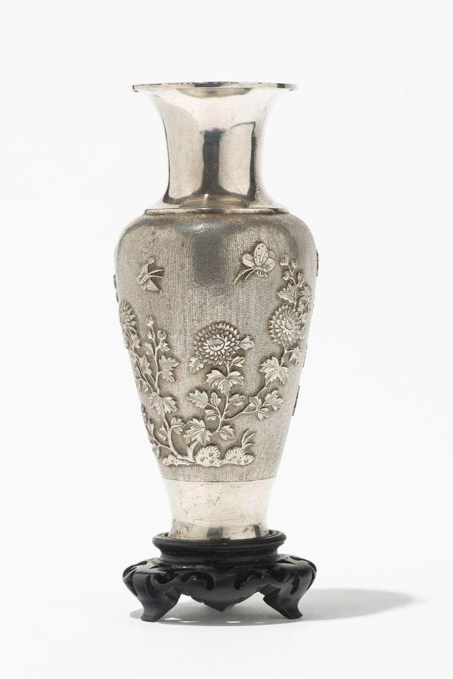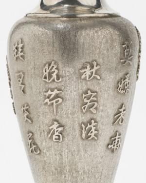 Argent à décor en relief de branches de fleurs, papillons et calligraphies, Chine, H 16 cm, 135 g brut
