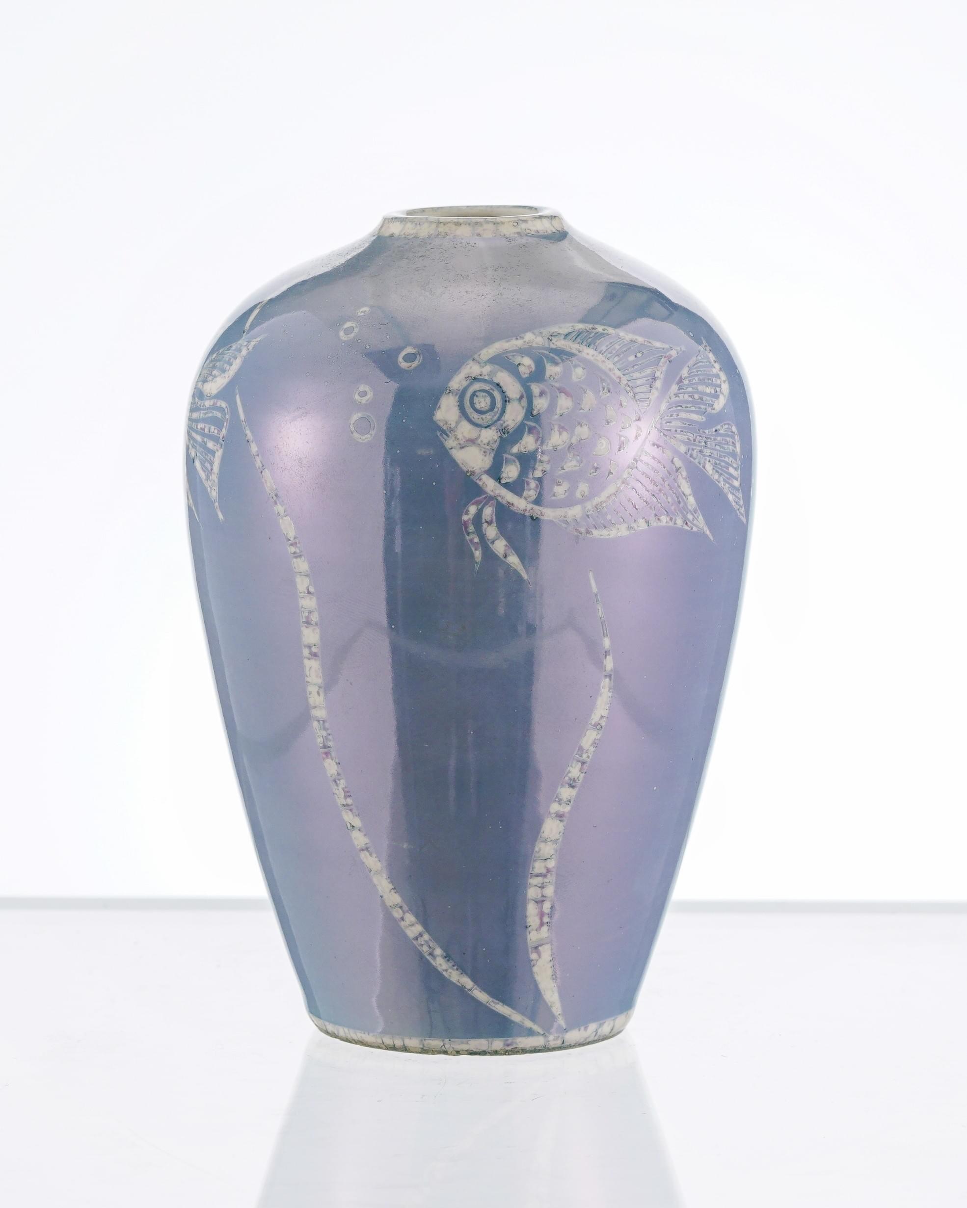Porcelaine bleu irisé et blanc à décor de poisson, signé, H 13,3 cm