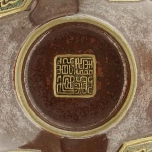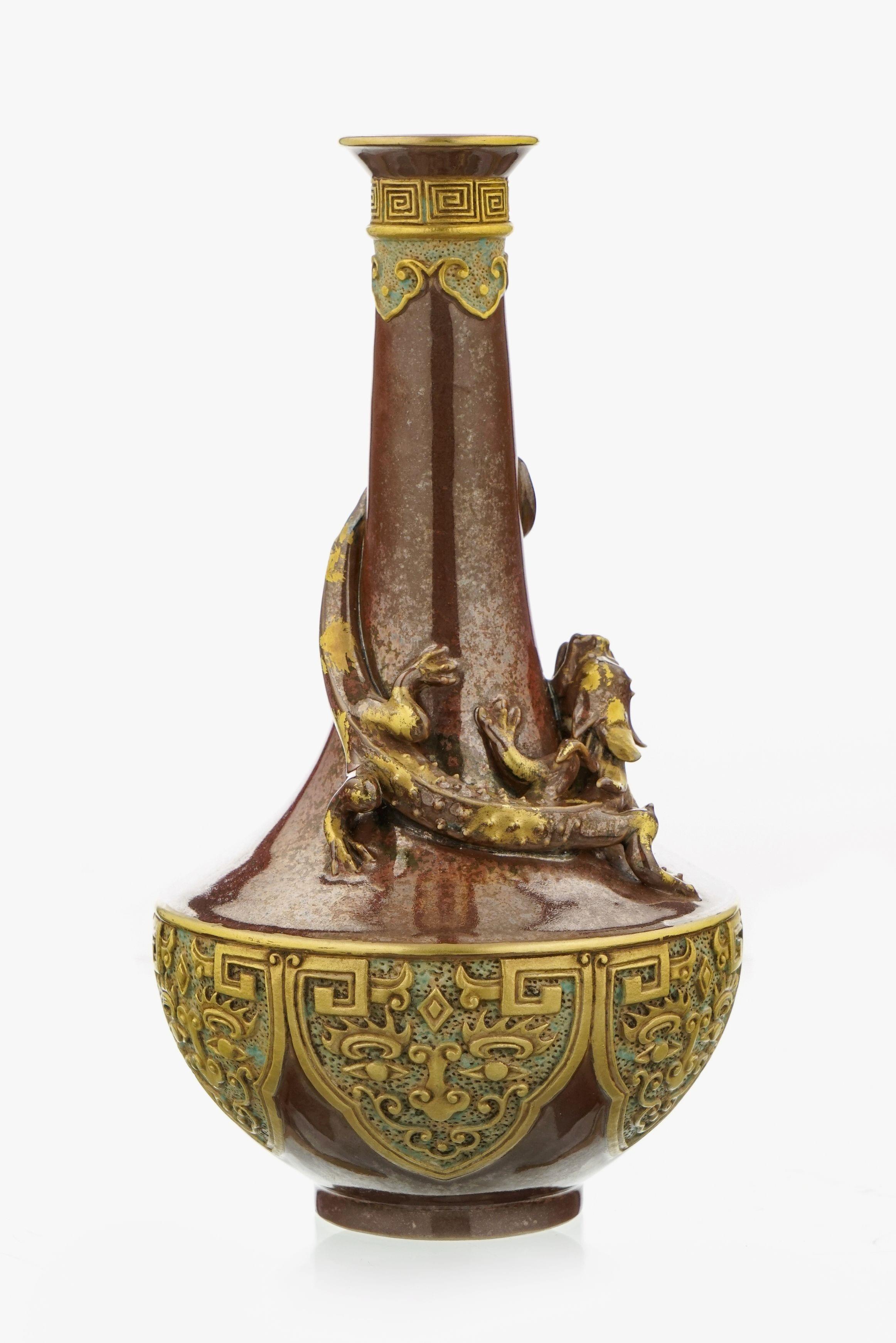Porcelaine émaillée à l'imitation du bronze patiné et doré et à décor en relief d'un dragon s'enlaçant autour du col et d'une frise d'agrafes en partie basse, H 18 cm