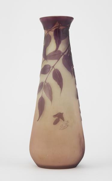 Verre multicouche dégagé à l'acide à décor de glycine violette sur fond rose, H 29,5 cm