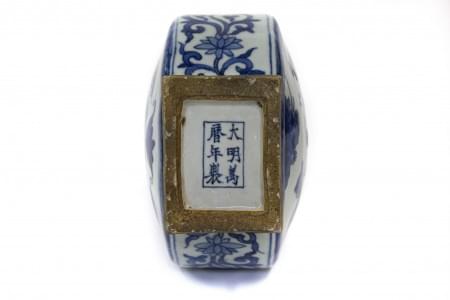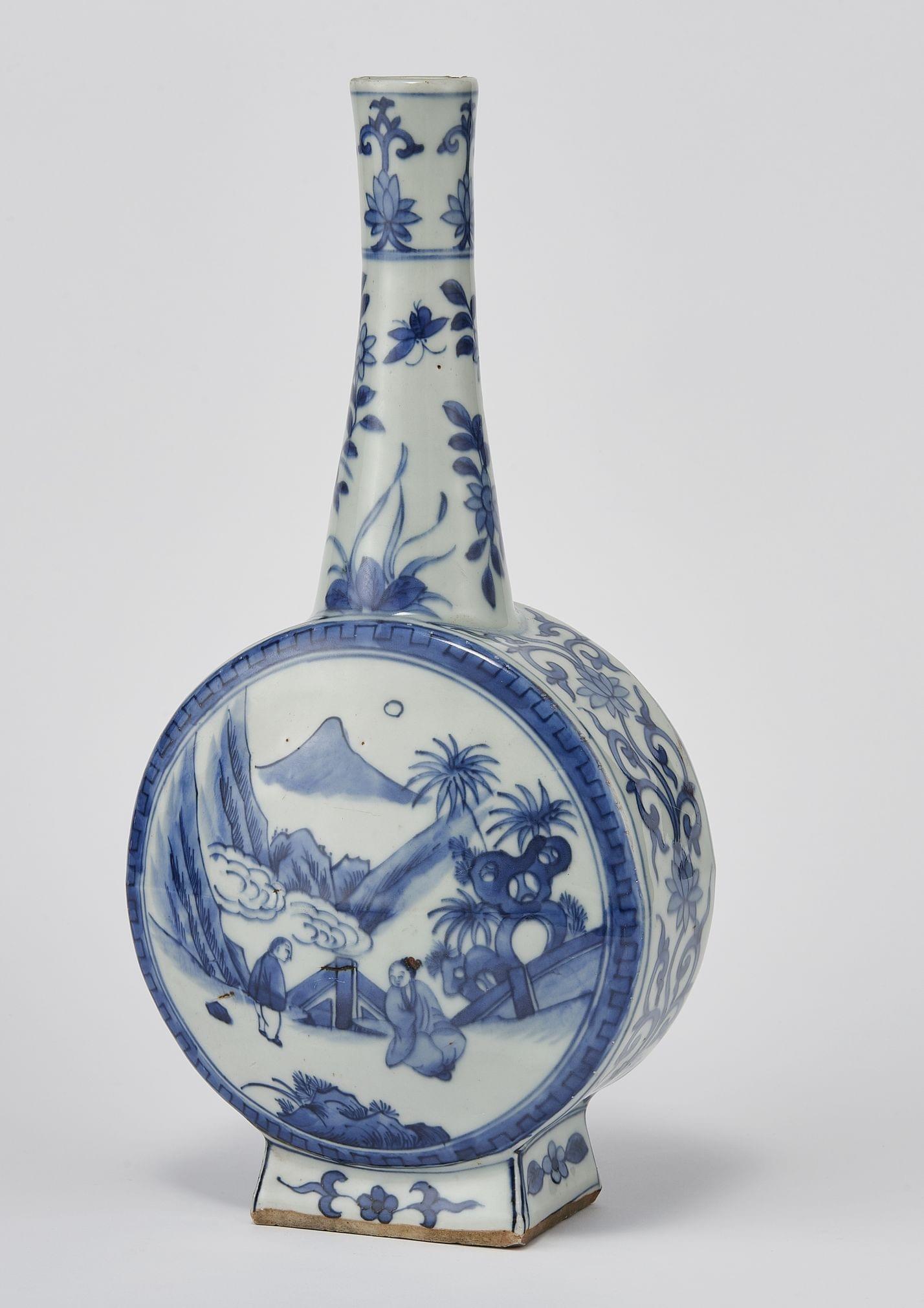 Porcelaine émaillée bleu blanc à décor d'un paysage animé et d'armoiries de Castille, H 31 cm