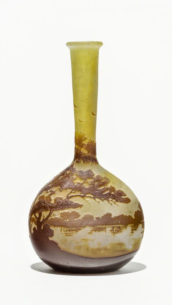 Verre multicouches dégagé à l'acide à décor d'un paysage lacustre brun sur fond jaune, H 16 cm