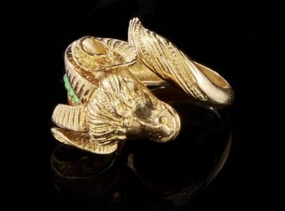 57. Bague à motif de bélier au dos serti d'émeraudes taille cabochon