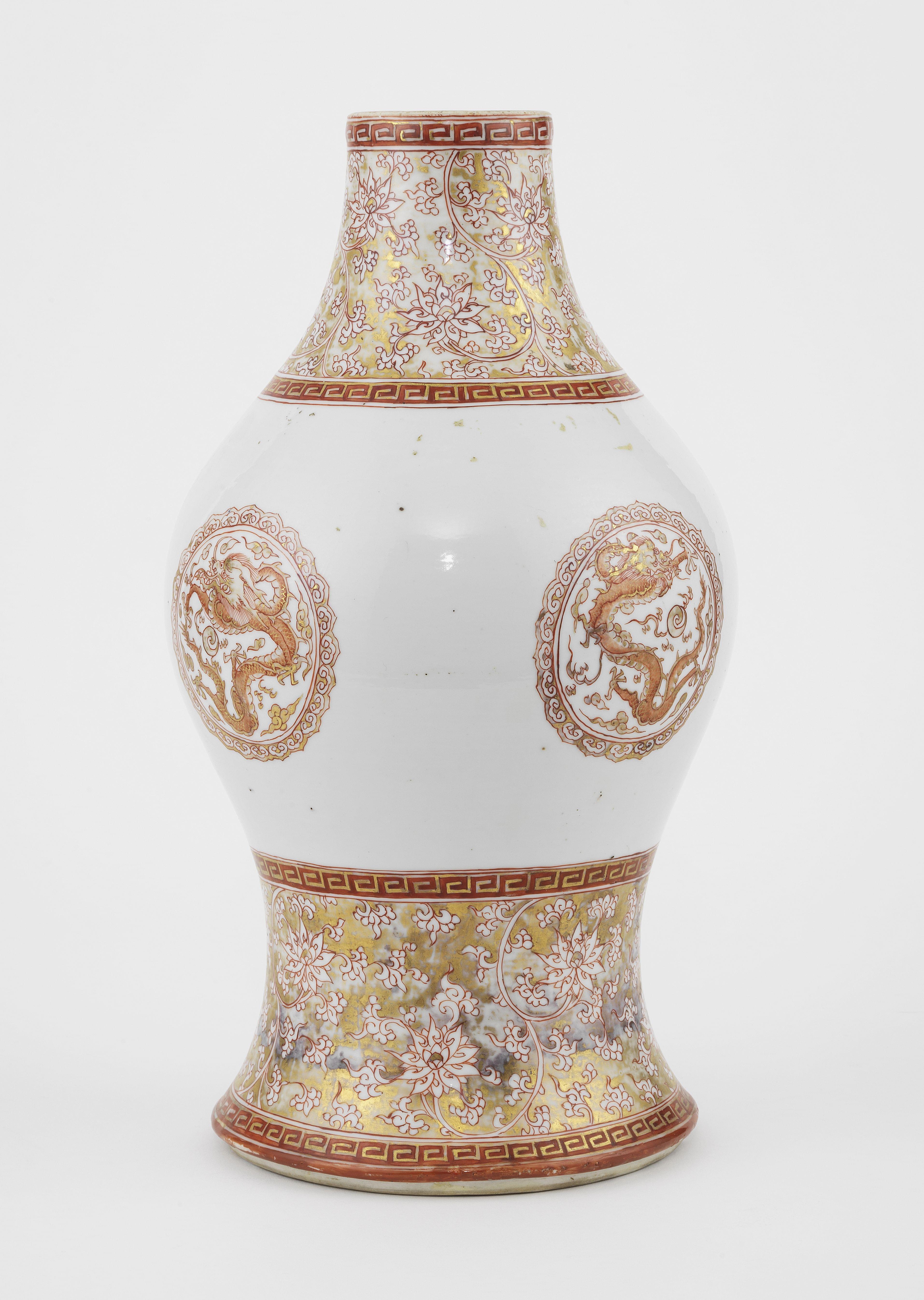 Porcelaine émaillée rouge de fer et or à motifs dans des médaillons de dragons poursuivant la perle sacrée, H 34 cm