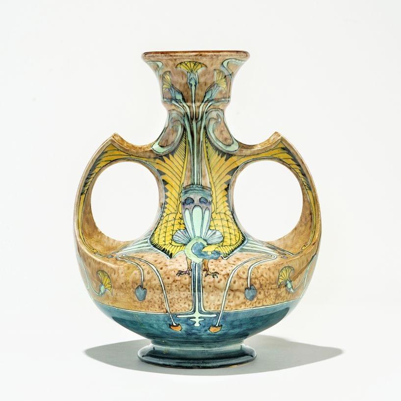 Deux anses latérales et col évasé, céramique émaillée polychrome à décor de paons, H 29 cm