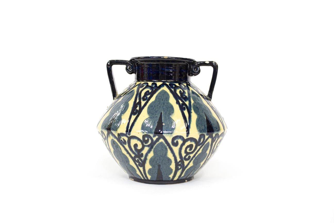 Céramique émaillée bleu sur fond jaune, H 17 cm