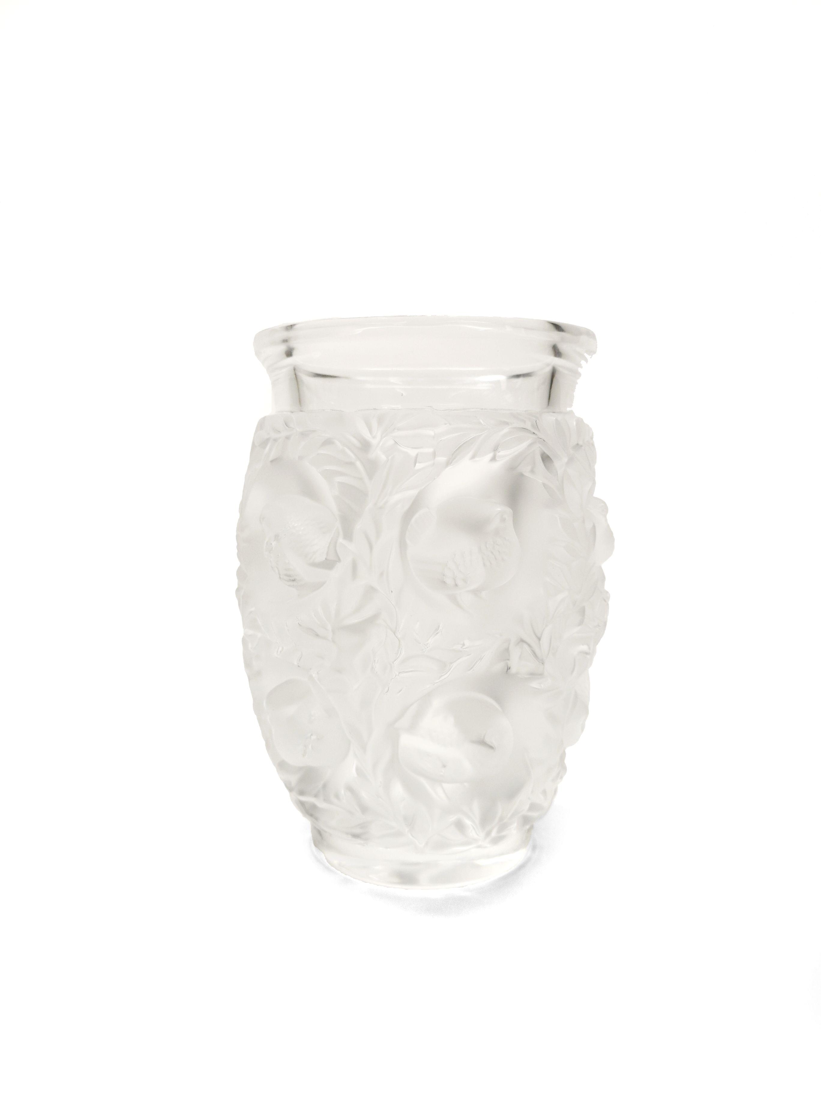 Verre moulé pressé et sablé à décor de rameaux et moineaux, H 17 cm