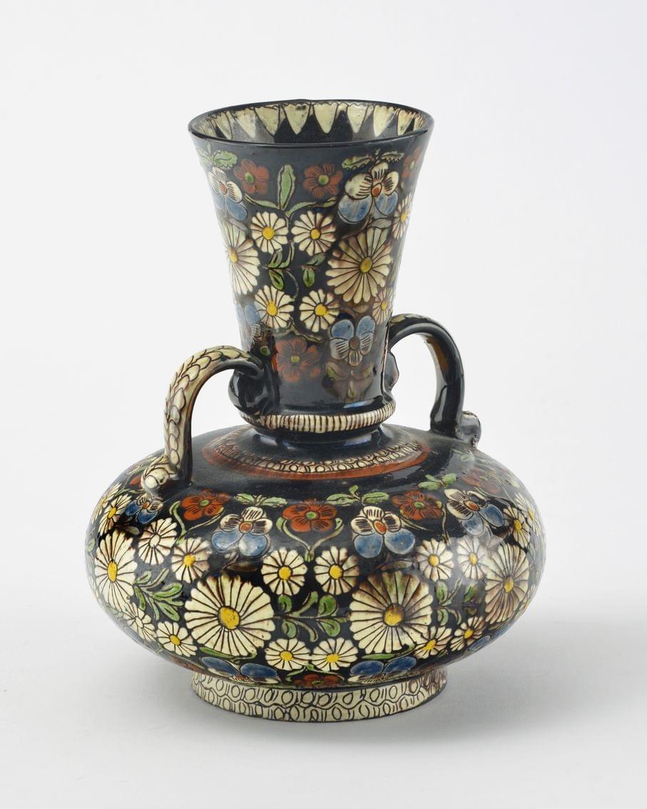 Terre vernissée à décor incisé de pensées et de marguerites, émaux polychromes, fond brun, non signé, H 22cm.