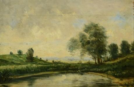 Paysage à l'étang, huile sur panneau, signée et datée 1919, 41x2...