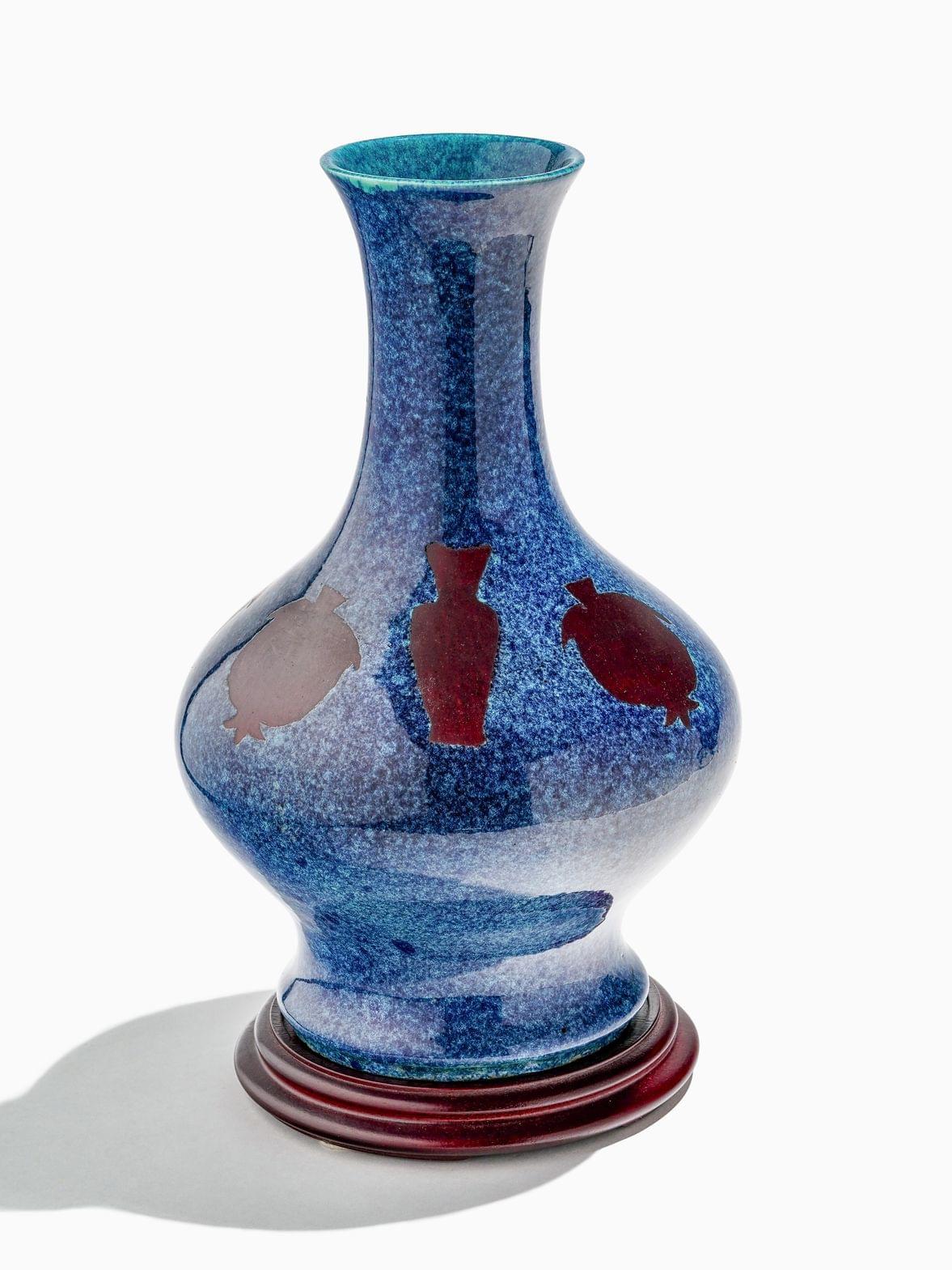 Porcelaine émaillée bleu flambé à décor de silhouettes de vases, H 32 cm