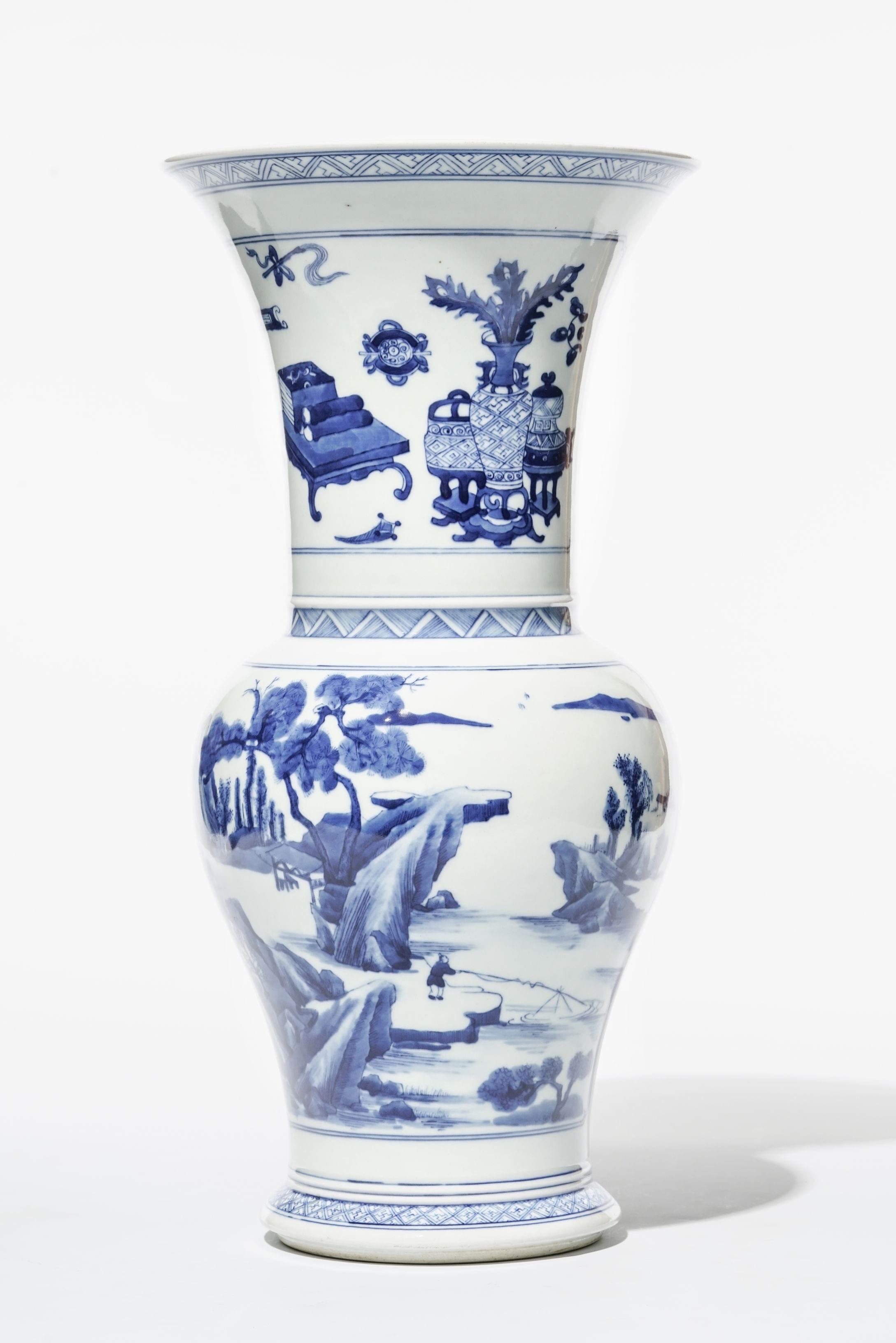 Porcelaine bleu blanc à décor de paysages animés et intérieur de lettré dans quatre réserves, H 38 cm