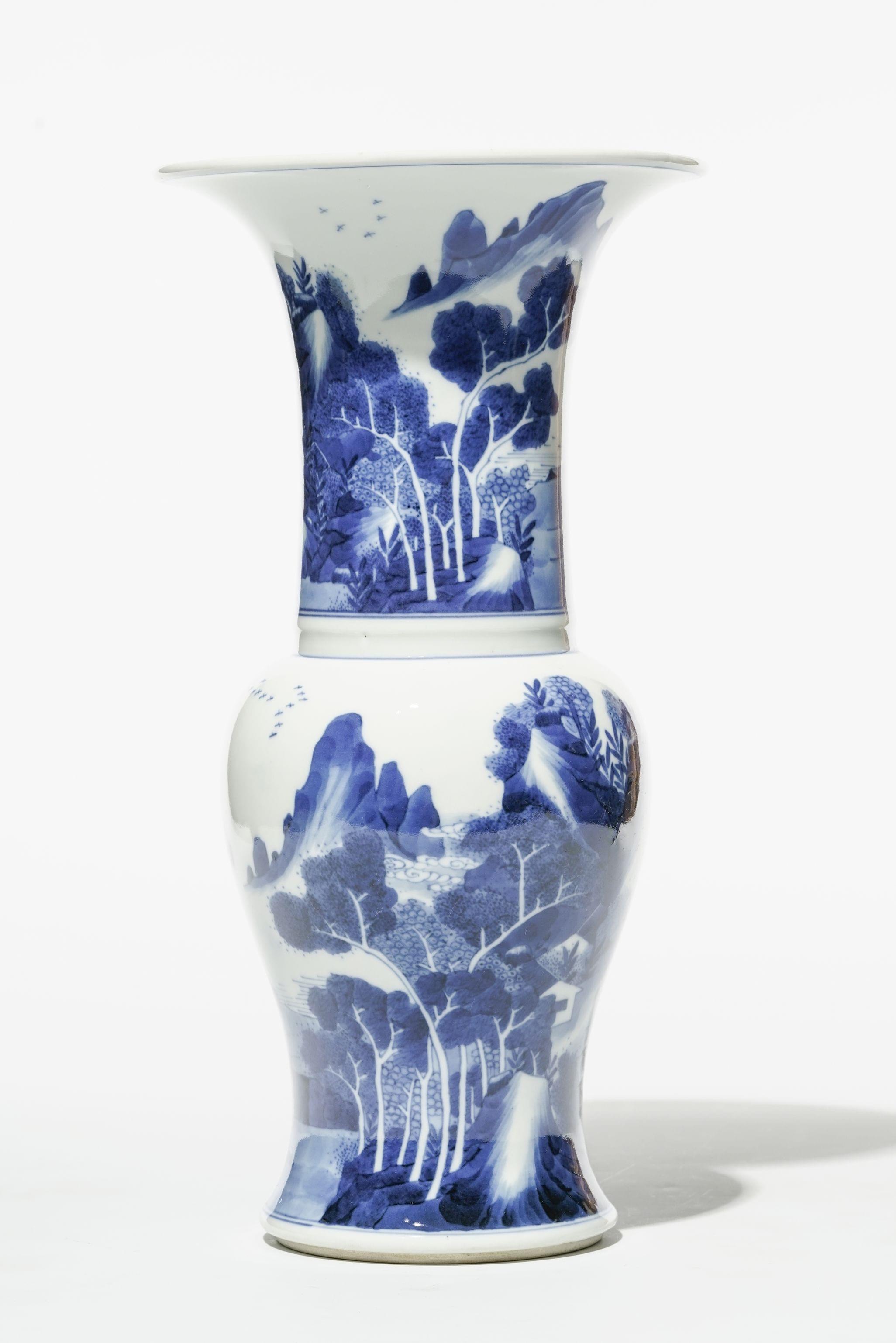 Porcelaine bleu blanc à décor de paysages animés dans deux réserves courant sur toute la largeur du vase, H 31,5 cm