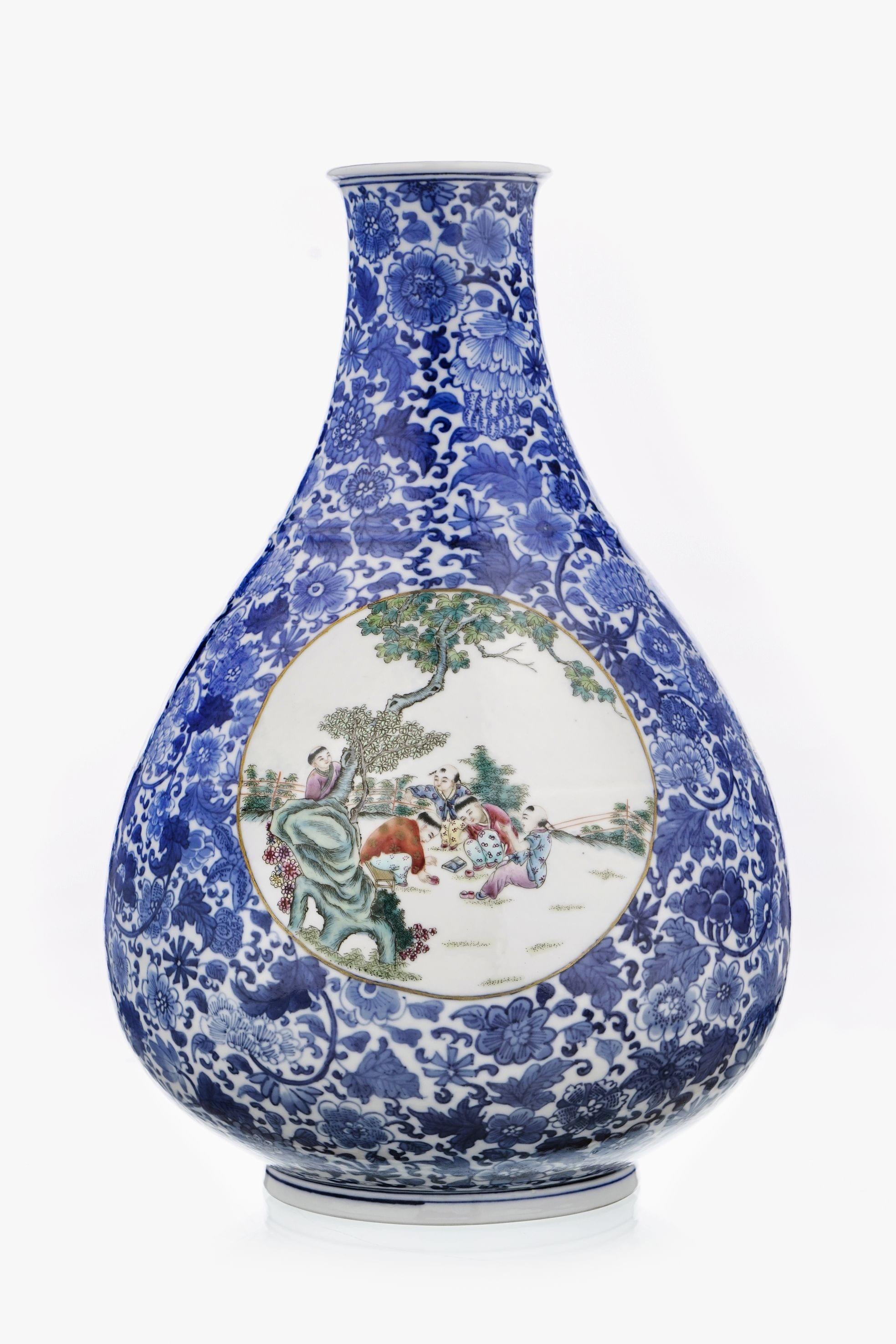 Porcelaine émaillée à décor de scènes animées polychromes en réserves sur fond bleu de motifs floraux, H 33 cm