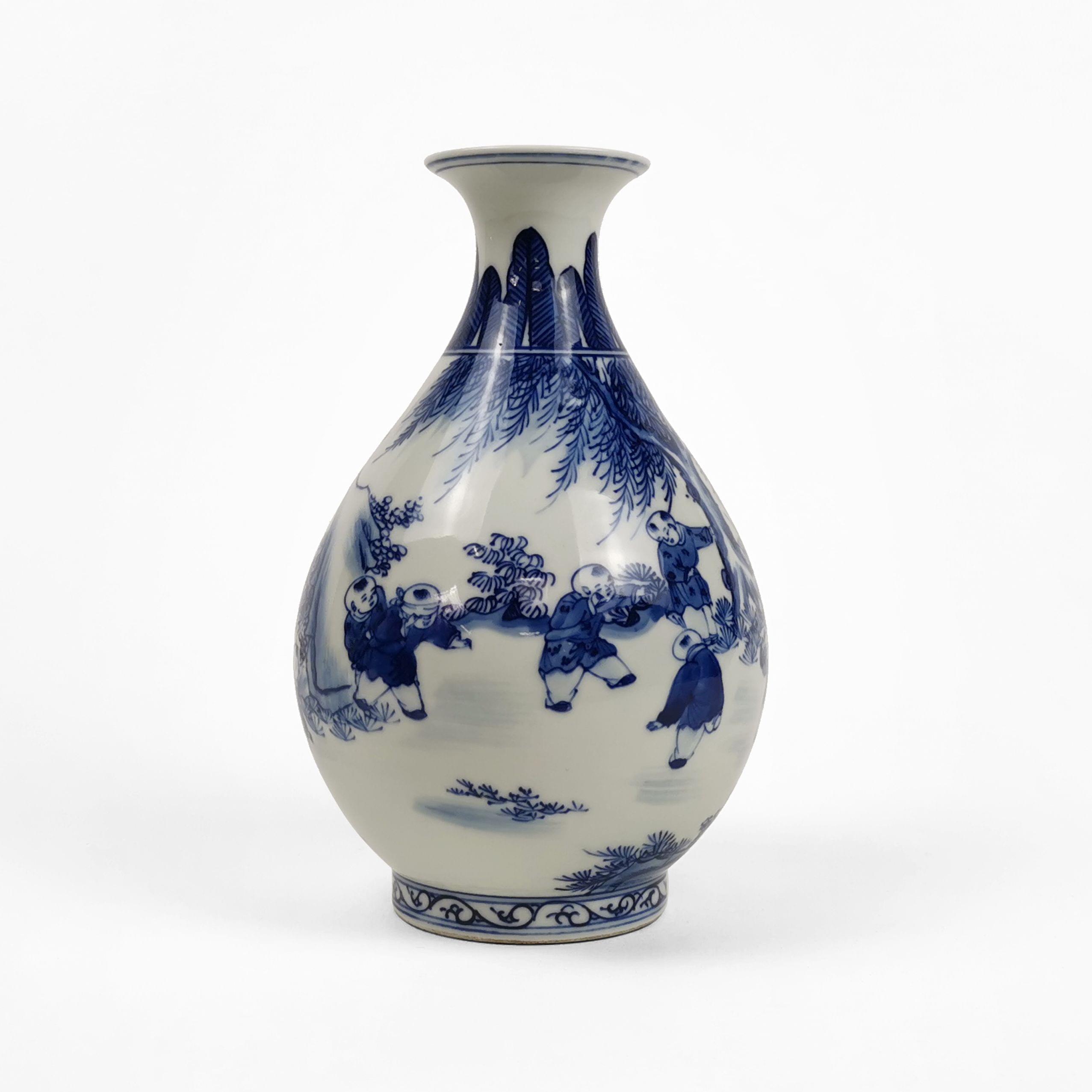 Porcelaine émaillée bleu blanc à décor d'enfants jouant dans un jardin, H 23 cm