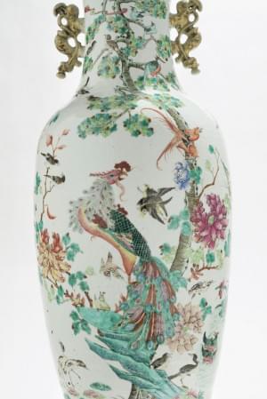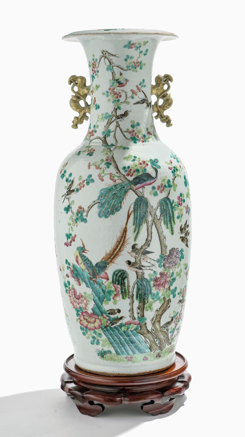 Porcelaine à décor polychrome de phénix, paon et oiseaux, pivoines et chrysanthèmes, H 61 cm