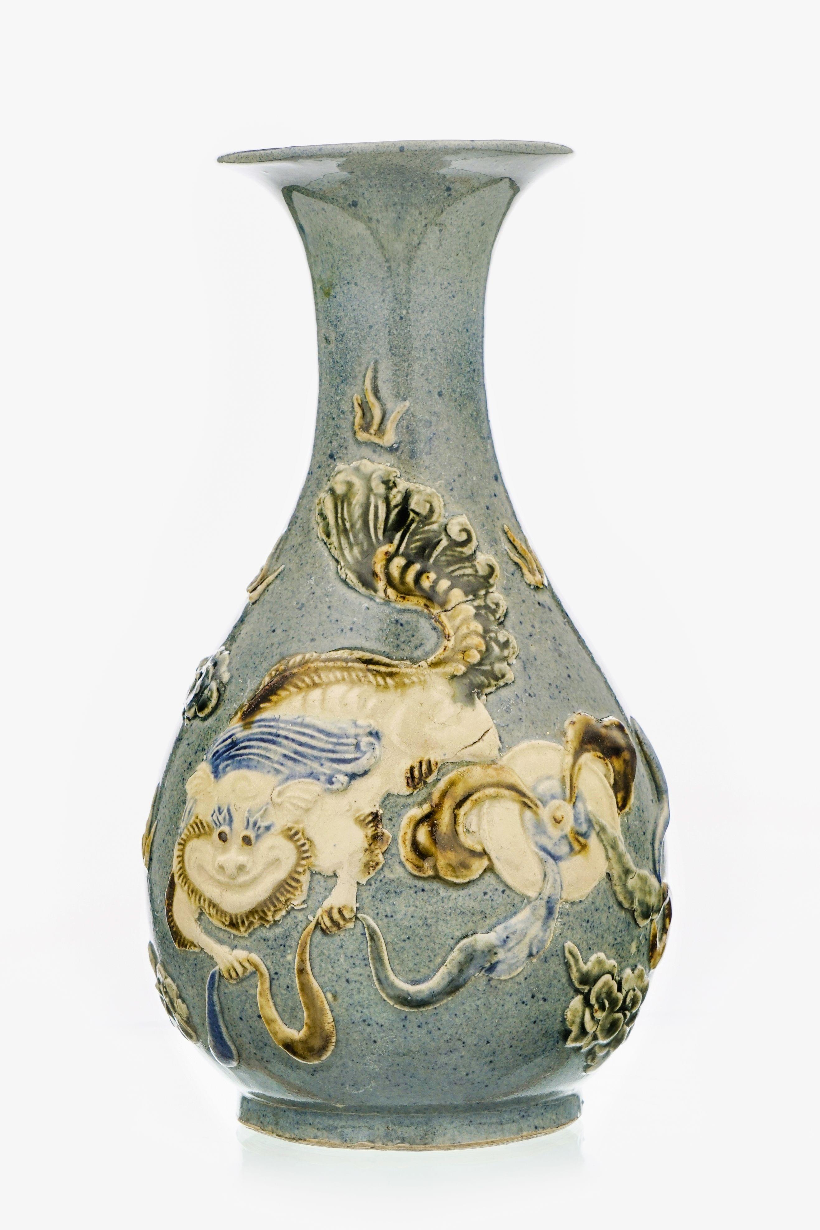 Porcelaine émaillée à décor d'un lion boudhique sur fond gris poudré, H 25 cm