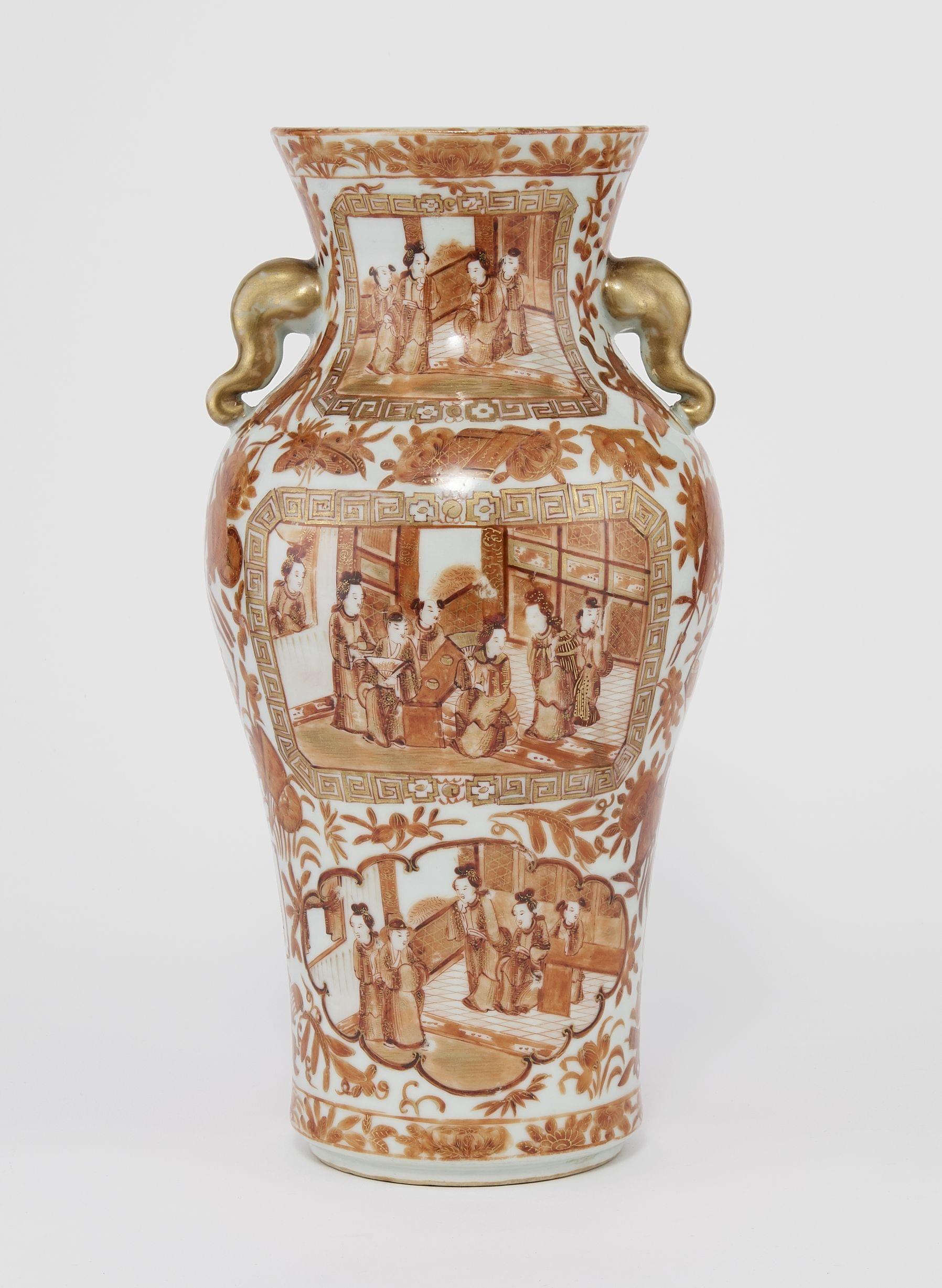 Porcelaine émaillée rouge de fer et or à décor de personnages, H 35,5 cm