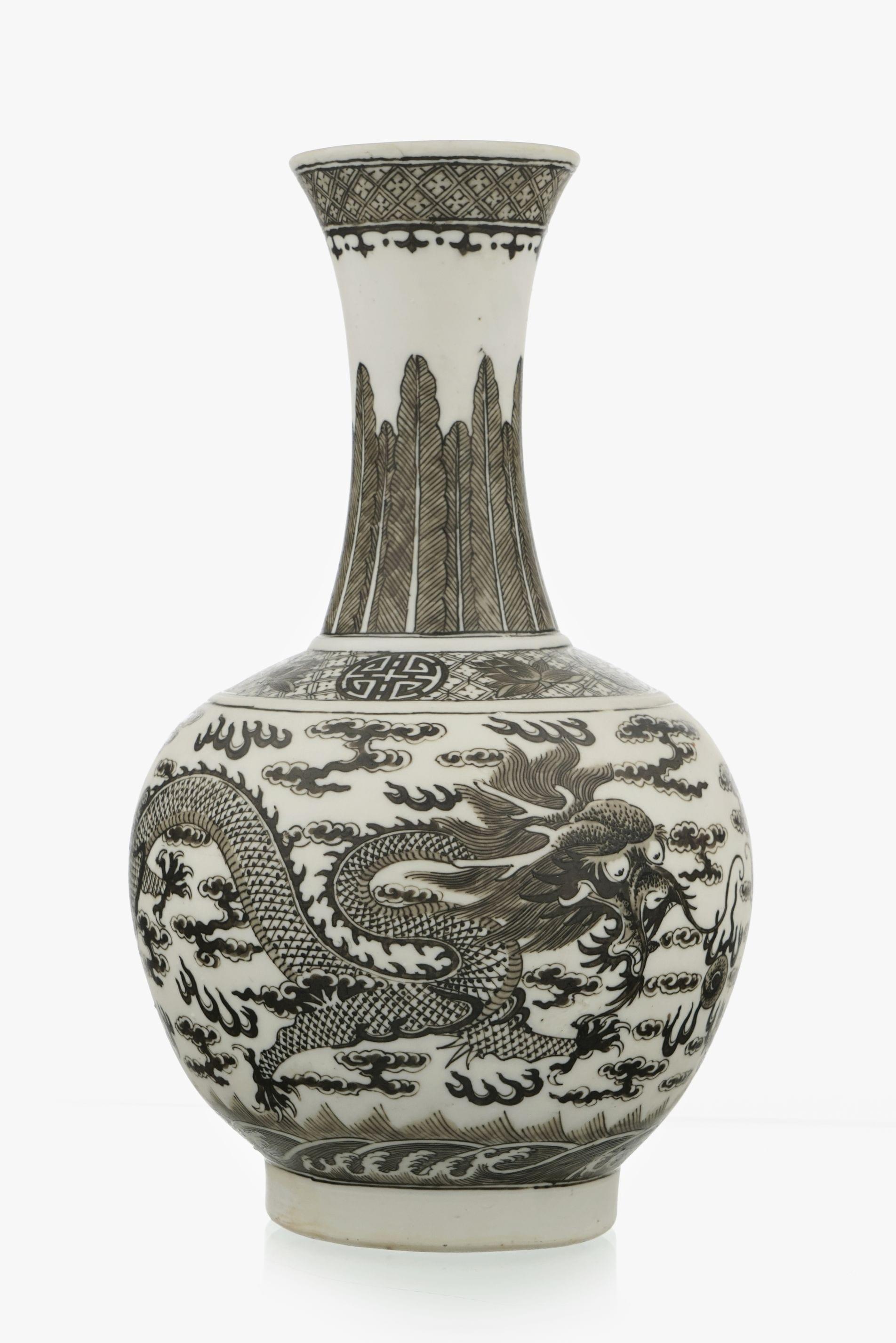 Biscuit émaillé à décor de dragons poursuivant la perle sacrée, H 30 cm.